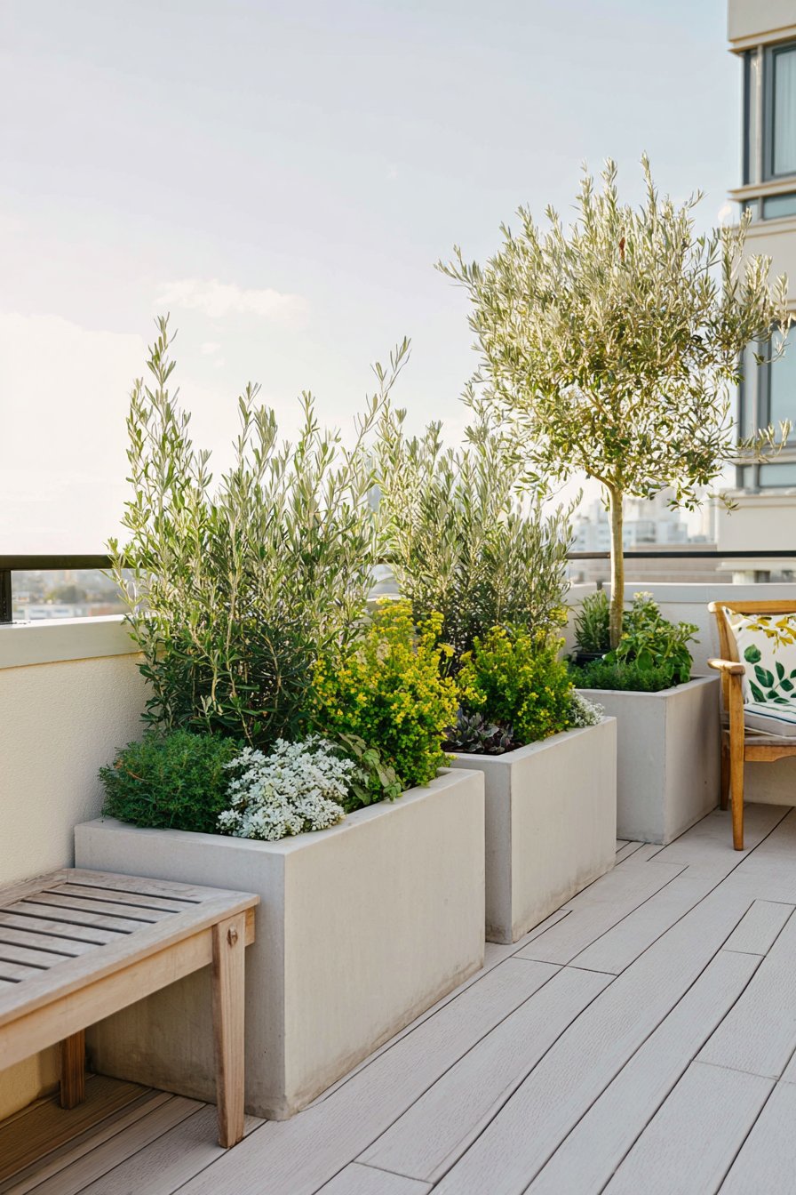 To achieve this look, consider planting varieties like lavender, rosemary, chives, and creeping thyme for a fragrant and visually appealing arrangement. Adding an olive tree will provide height and structure, enhancing the overall design.