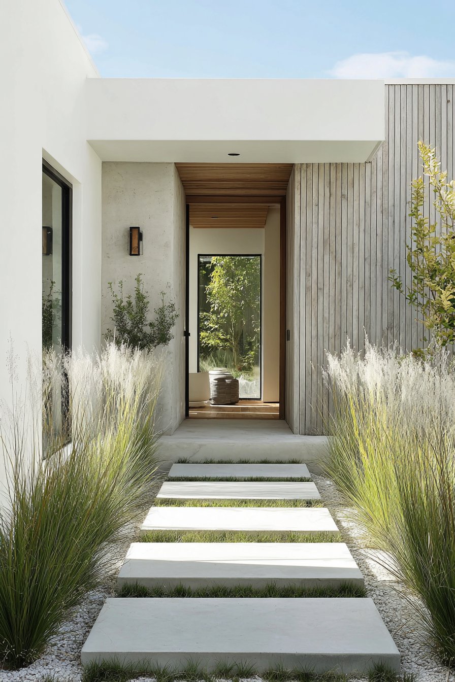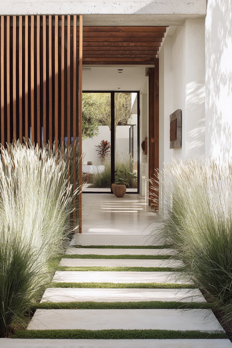 This design beautifully marries clean lines with natural textures, featuring a serene pathway framed by soft grasses and minimalist stone elements. For a similar effect, use a combination of ornamental grasses and sleek concrete pavers to create a tranquil entrance.