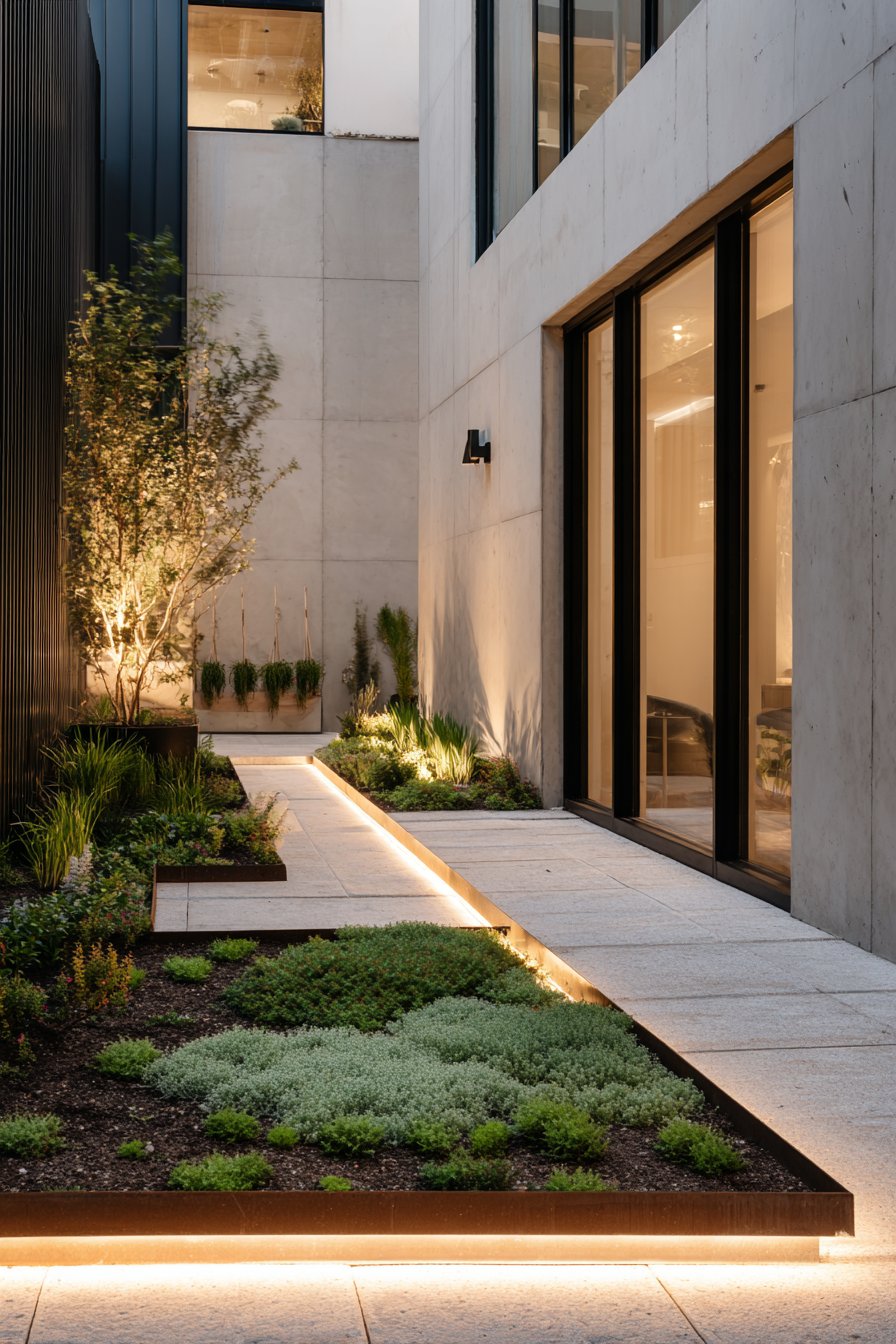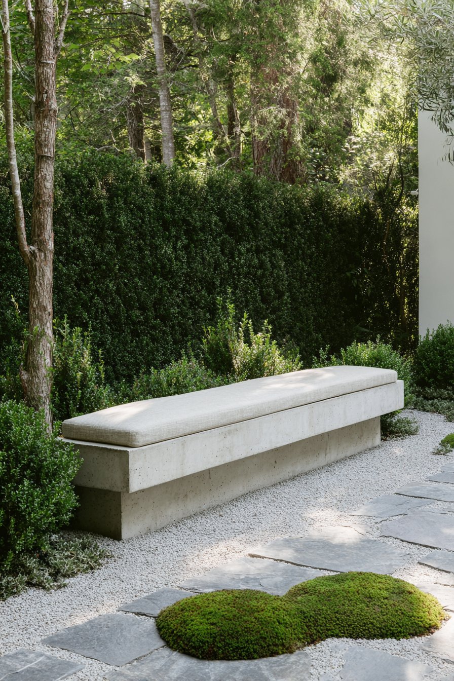 The clean lines of the stone path harmonize beautifully with the lush greenery, creating a serene minimalist oasis perfect for relaxation. Incorporating soft textures like ground cover and contrasting shapes in plant heights enhances visual interest while maintaining a cohesive look.