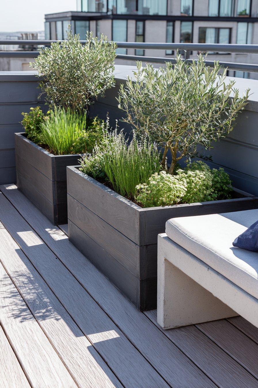 The sleek, dark wood planters beautifully contrast with vibrant greenery, creating a tranquil minimalist garden that invites relaxation and connection with nature. Incorporating varied textures through herbs and small shrubs enhances visual interest while maintaining a clean, modern aesthetic.