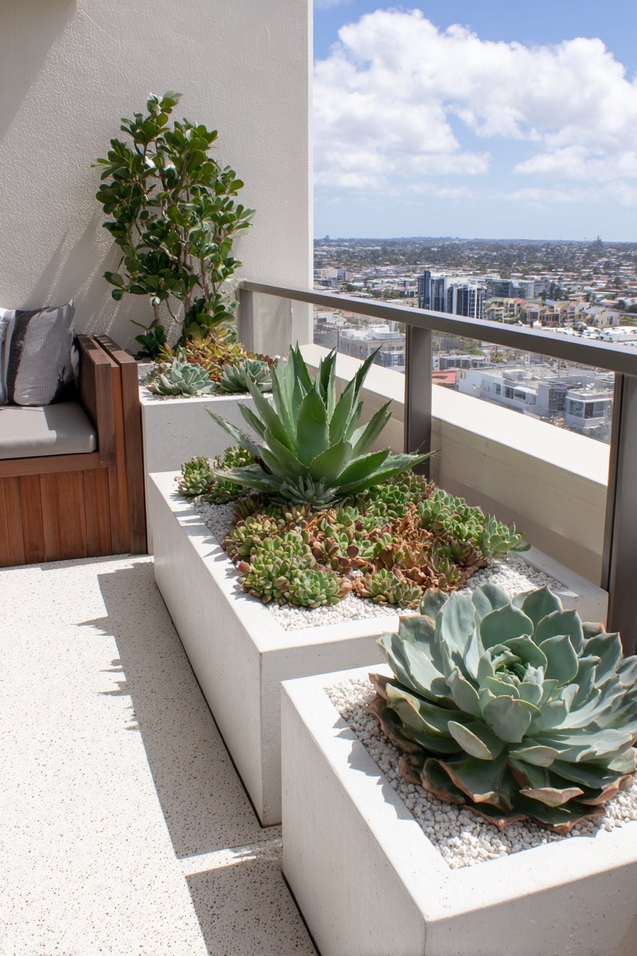 The sleek, minimalist design featuring geometric concrete planters creates a sophisticated yet inviting atmosphere, enhanced by the vibrant greens and soft textures of the succulents. To achieve this look, incorporate a mix of varying heights and shapes, ensuring a balance of visual interest and harmony in your space.