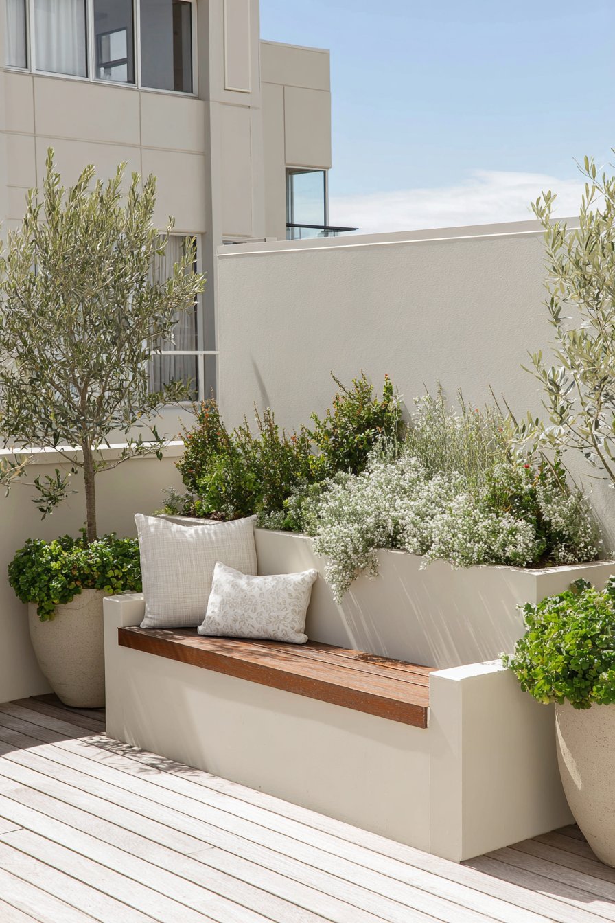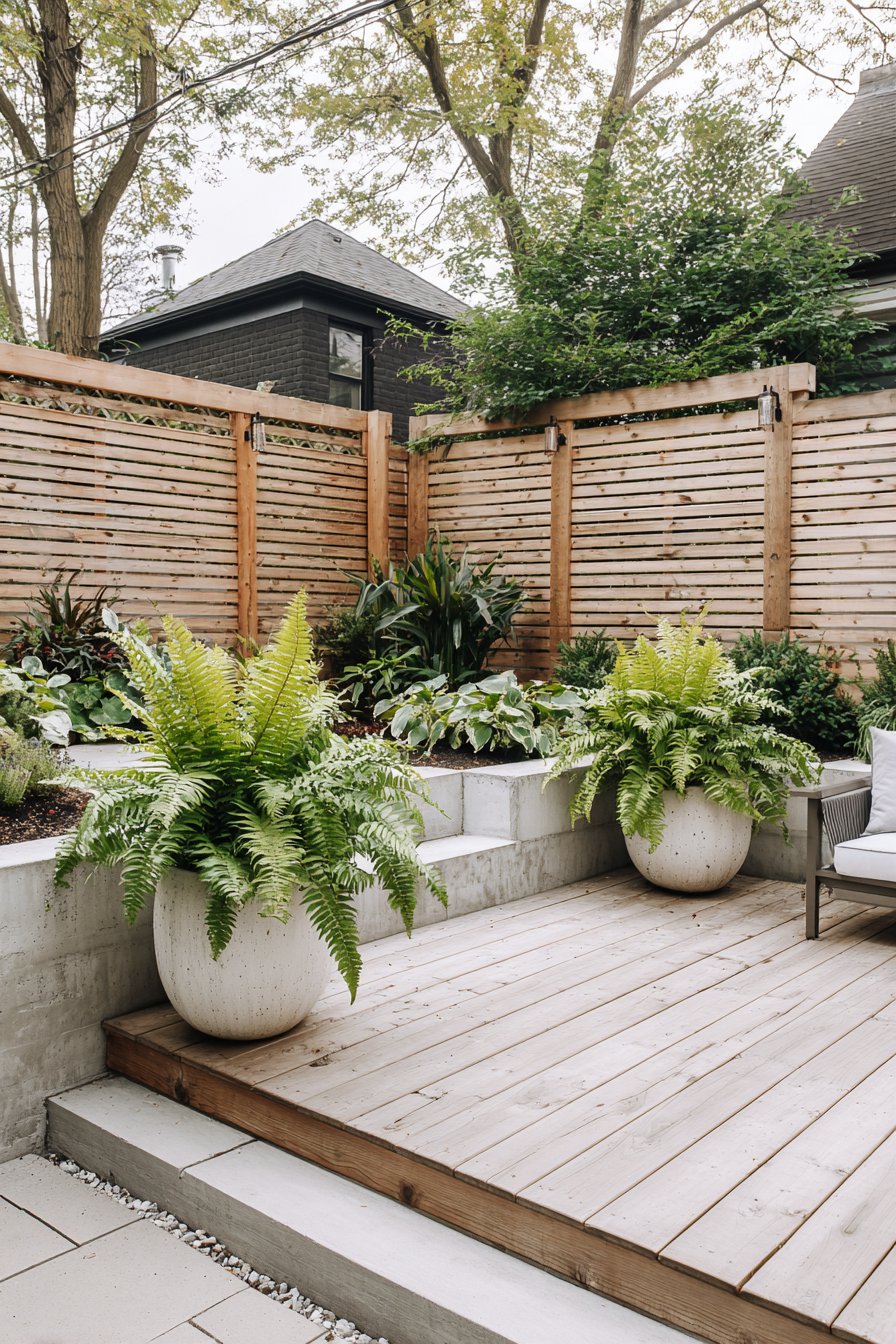 The sleek concrete planters paired with lush greenery create a serene, contemporary atmosphere, emphasizing simplicity and natural beauty. To achieve this look, use a mix of textures and colors, ensuring a harmonious balance between tall, airy plants and dense, low-growing varieties.