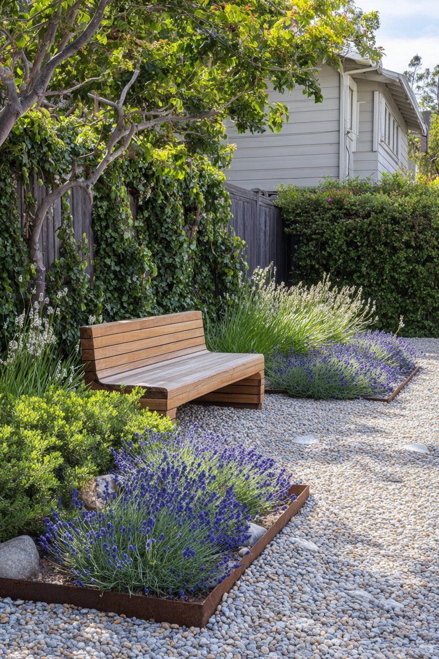 This serene garden beautifully combines soft lavender hues with the earthy textures of gravel, creating a tranquil minimalist retreat. Incorporate simple wooden seating and lush greenery to enhance the calming atmosphere while ensuring easy maintenance.