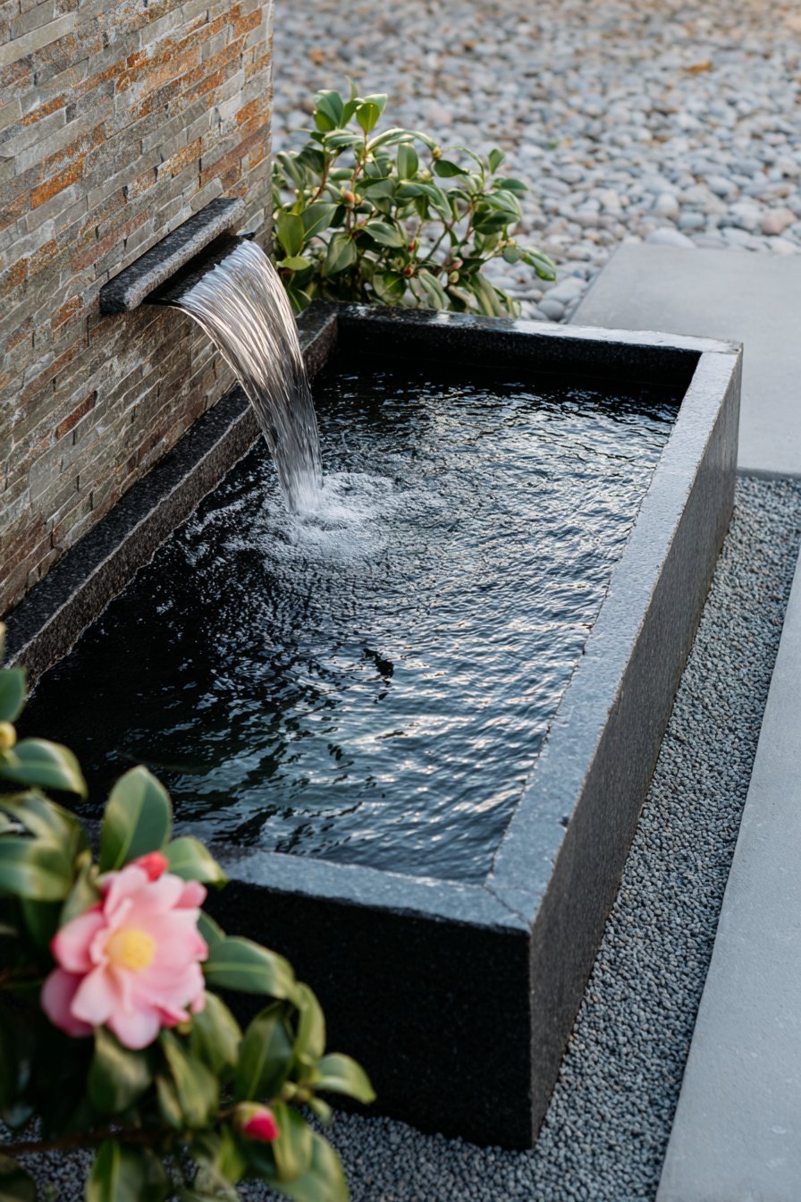 The serene water feature, framed by minimalist plants, creates a calming atmosphere with its sleek lines and harmonious textures in muted tones. To achieve a similar tranquil space, incorporate smooth pebbles and a simple, modern water element alongside carefully selected greenery for balance.