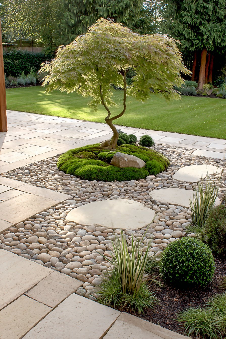 This serene design embraces minimalist aesthetics with smooth pebbles, lush moss, and a graceful tree, creating a tranquil retreat. Incorporate natural stone elements and carefully chosen greenery for a harmonious balance of textures and colors in your garden.