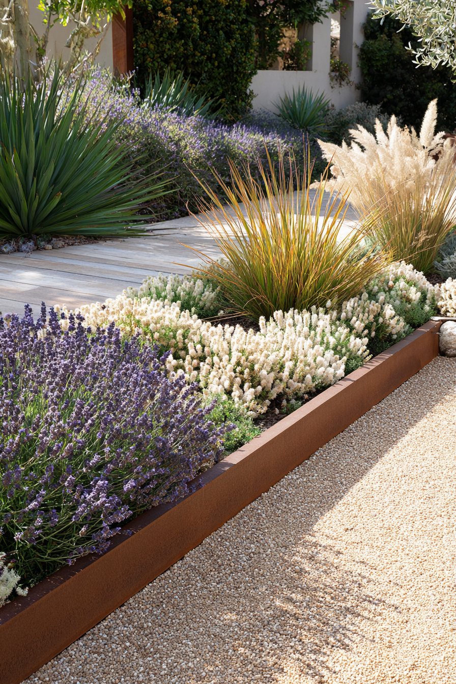 The harmonious blend of lavender and ornamental grasses creates a tranquil, minimalist oasis, showcasing soft purples and earthy tones that invite serenity. For a similar look, incorporate gravel paths and rust-colored borders to enhance texture and structure while keeping maintenance low.