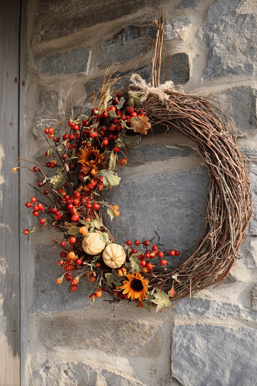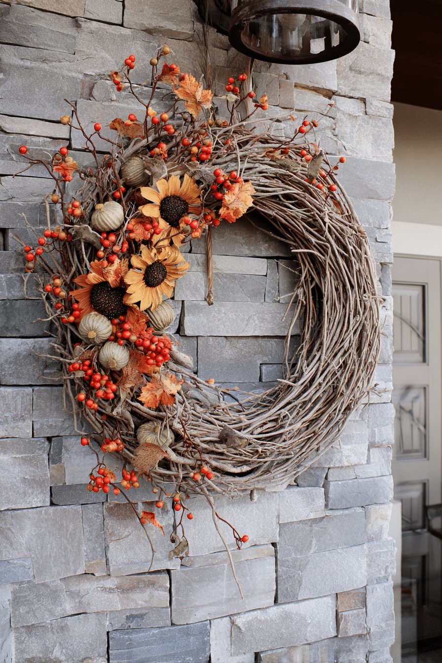 Pair it with matte lanterns or brass candlesticks, a stack of neutral pumpkins, and a woven doormat or plaid runner for extra warmth. Add potted ornamental grasses, muted mums, or a vase of eucalyptus nearby to echo the wreath’s foliage. If you want a little glow, tuck a strand of warm fairy lights into the vines and call it cozy, done, and very welcoming.
