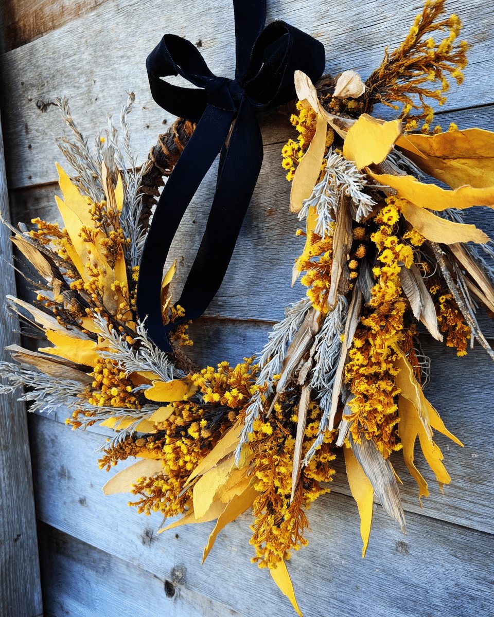 I love the sunbaked mustard tones and the mix of dried textures here, it reads like autumn in an easy, stylish outfit. The pops of golden blooms against silvery foliage feel warm without being twee, and that black velvet ribbon gives it a little chic, theatrical moment.