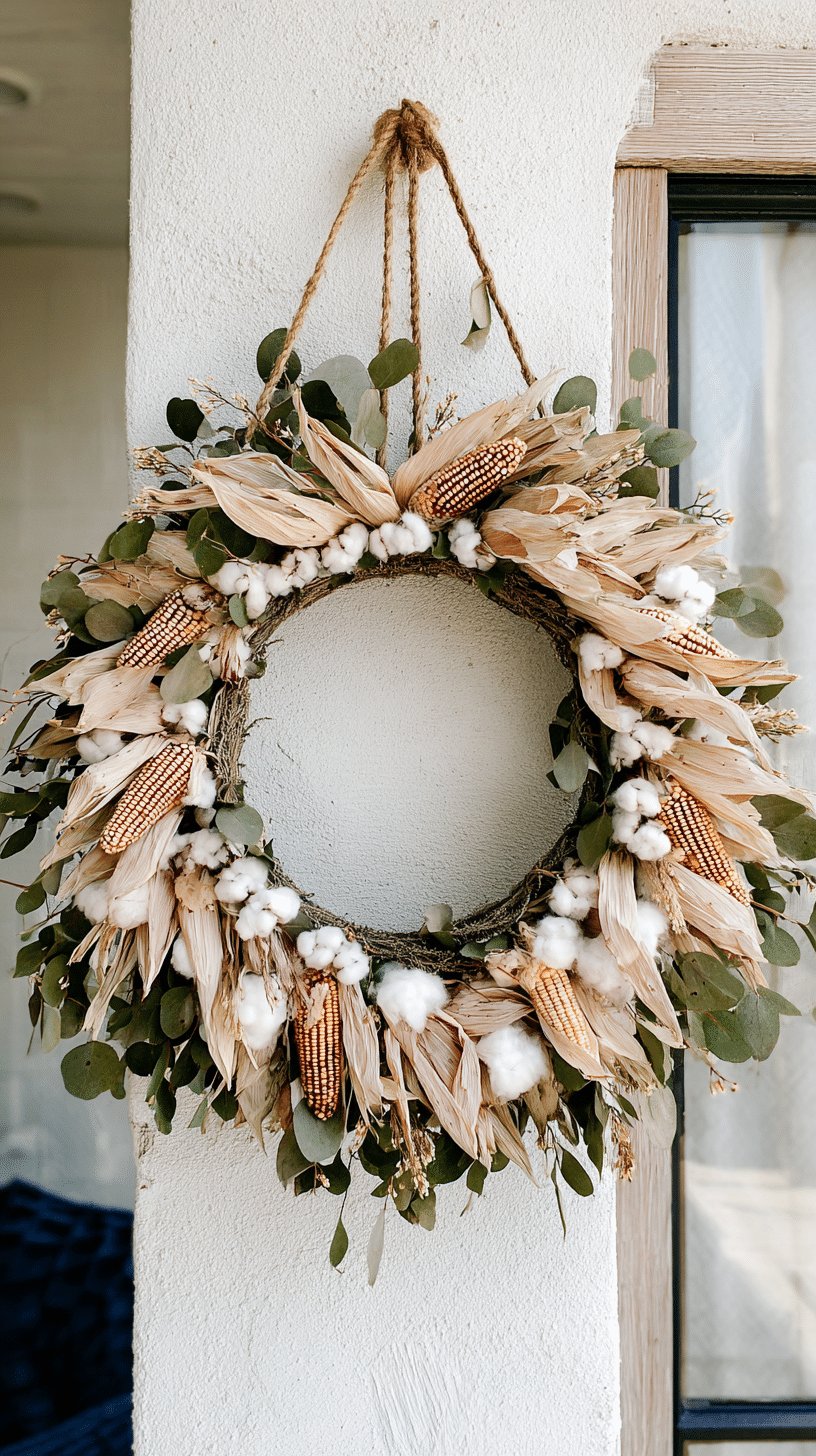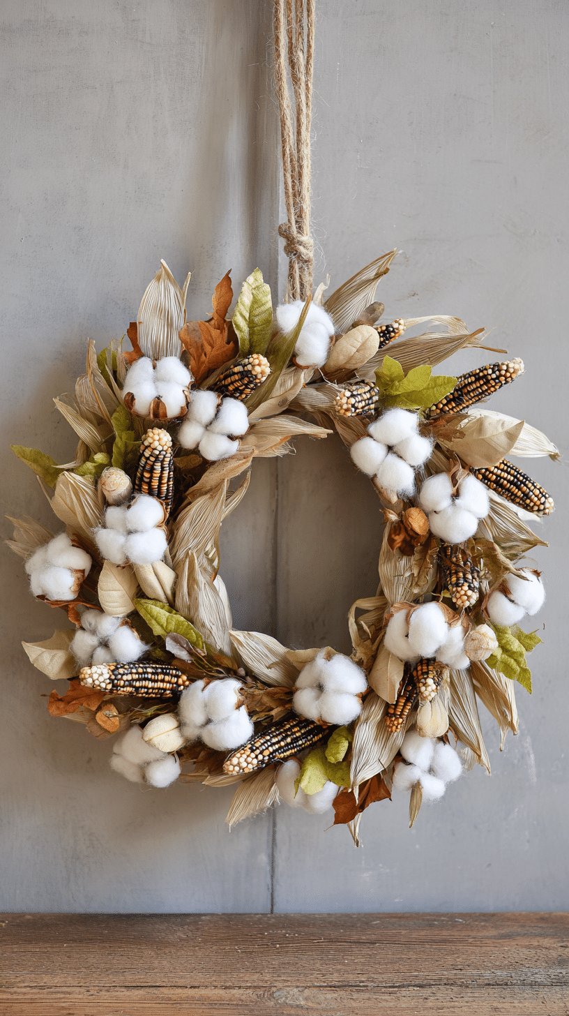 I love the cozy, textural play here — those fluffy cotton bolls popping against dried corn and papery leaves give the wreath a warm, lived-in vibe that feels like a hug from fall.