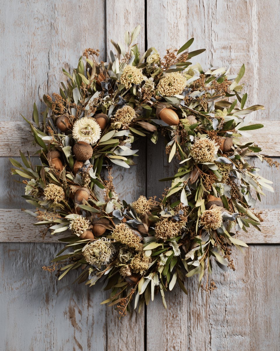 I love the mellow, gathered-from-the-garden vibe of this wreath. The mix of silvery eucalyptus, crunchy seed heads, and rich acorn caps gives it so much texture and quiet charm that it feels cozy without shouting. It sings on a weathered front door, above a wood mantel, or as a table centerpiece for a relaxed Thanksgiving dinner.