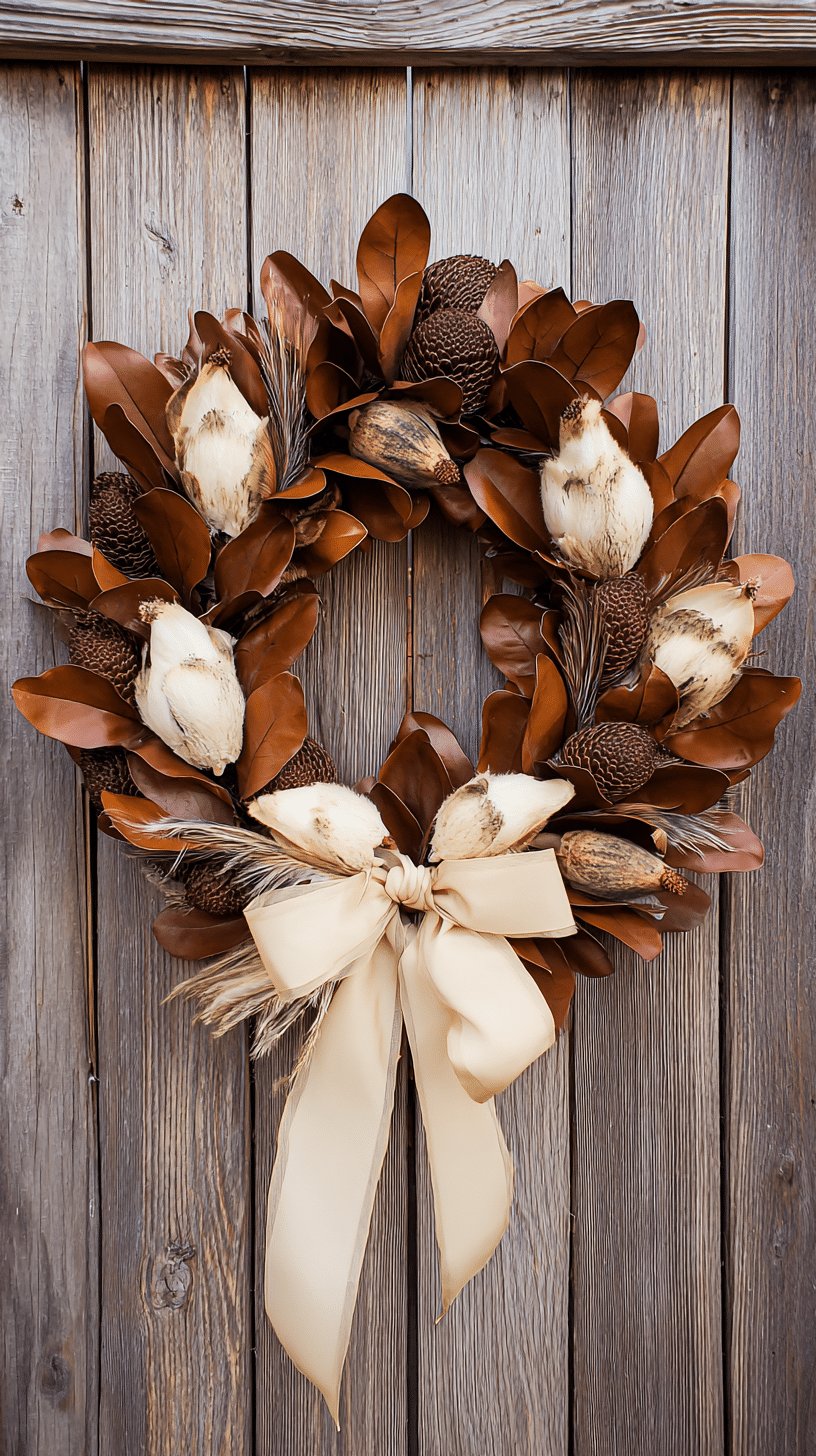 I love how this wreath reads cozy and curated without trying too hard. The rich brown leaves give it warm, almost leather-like depth while the creamy dried pods add sculptural contrast and a touch of softness.
