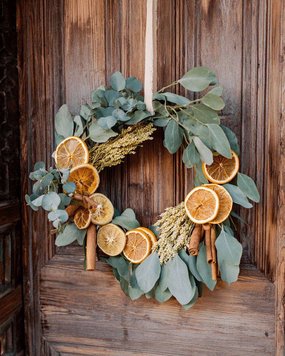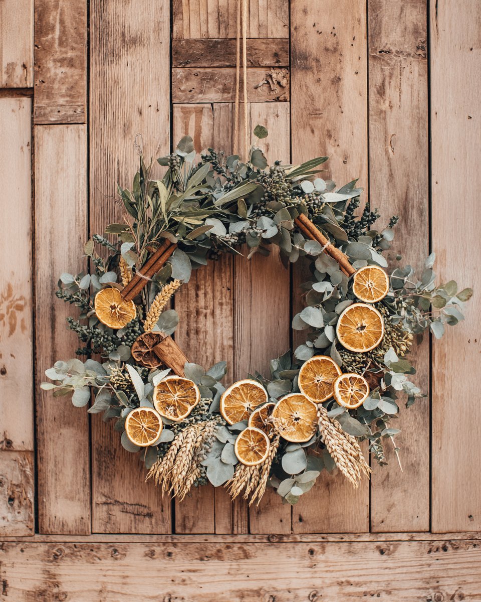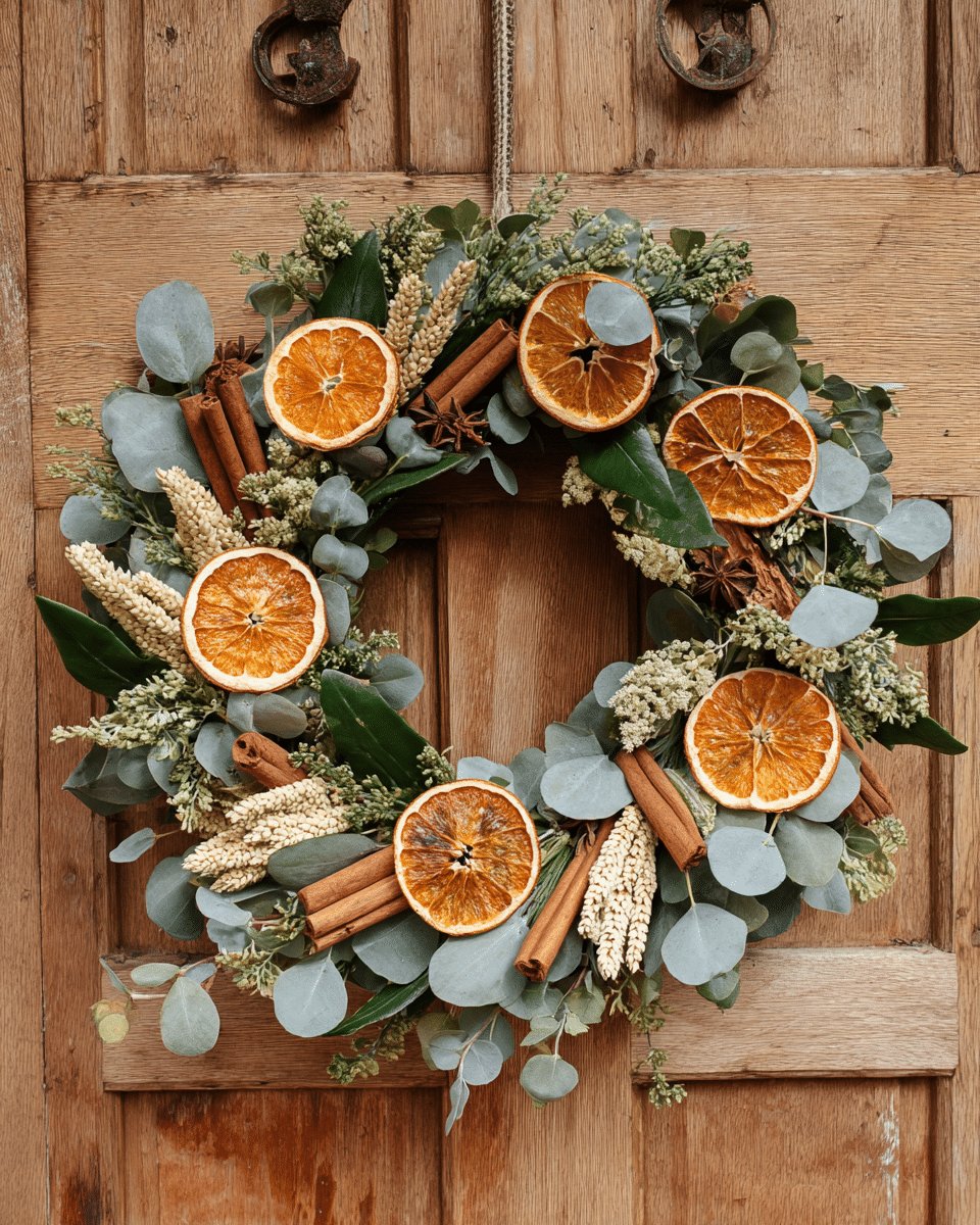 I love how this wreath does cozy without trying too hard. The dried orange slices give that pop of autumn sunshine, the eucalyptus adds soft blue-green texture, and the cinnamon sticks and star anise read like a promise of warm spice.