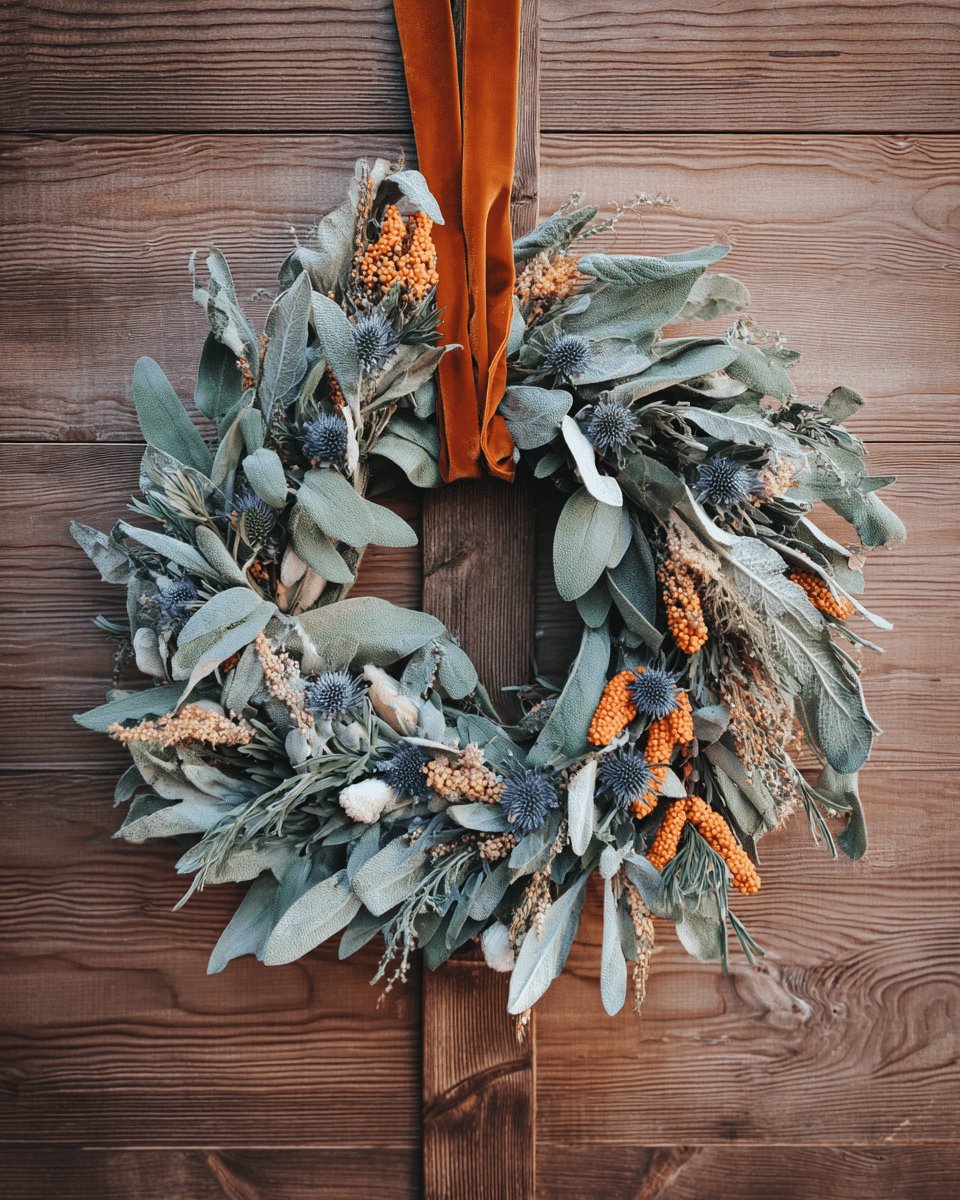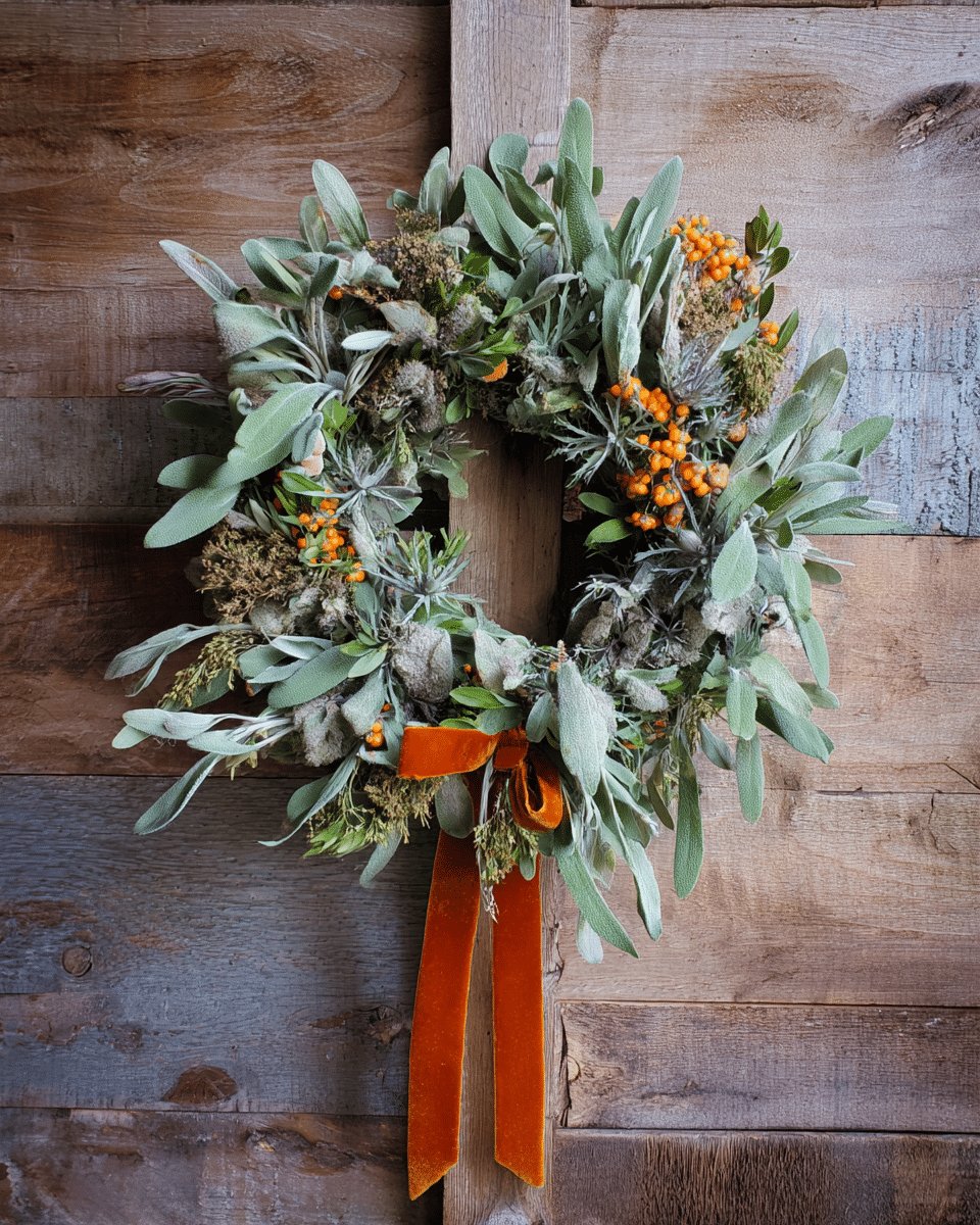 I love how the muted sage leaves and fuzzy textures make this wreath feel soft and lived in, while the little clusters of orange berries and that velvet ribbon give it just the right pop. It reads autumnal without shouting, so it feels polished but cozy.