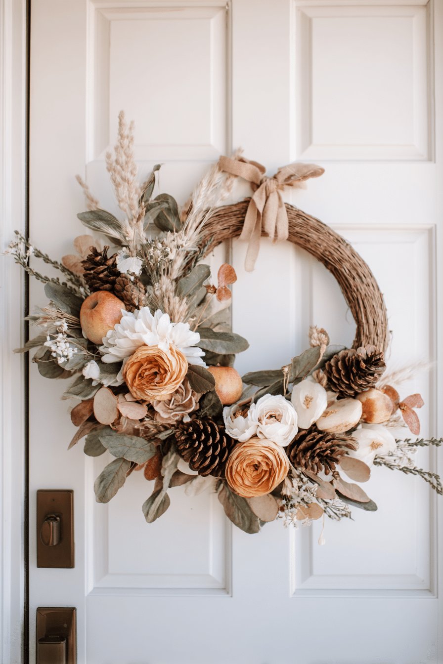 I love how this wreath feels like autumn turned down to a cozy whisper. The grapevine base and dried grasses give it that effortlessly rustic vibe, while the soft blush ranunculus, eucalyptus leaves, apples, and pinecones make it feel rich without being fussy.