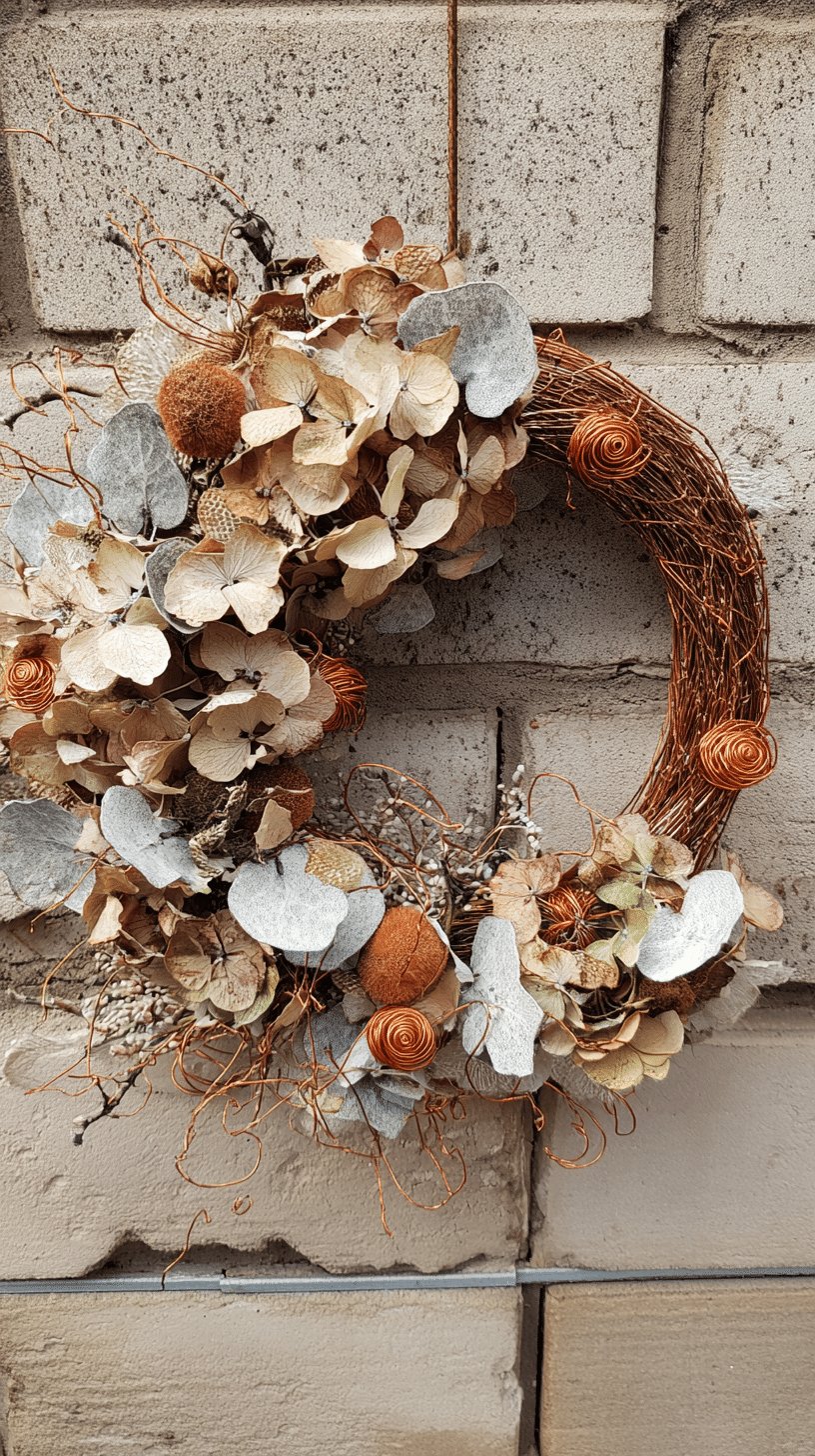 I love the soft, vintage vibe of this Thanksgiving wreath. The faded hydrangea petals and silvered leaves feel like autumn captured in a whisper, while the twiggy grapevine base and copper wire rosettes add just enough texture and sparkle to keep things interesting.