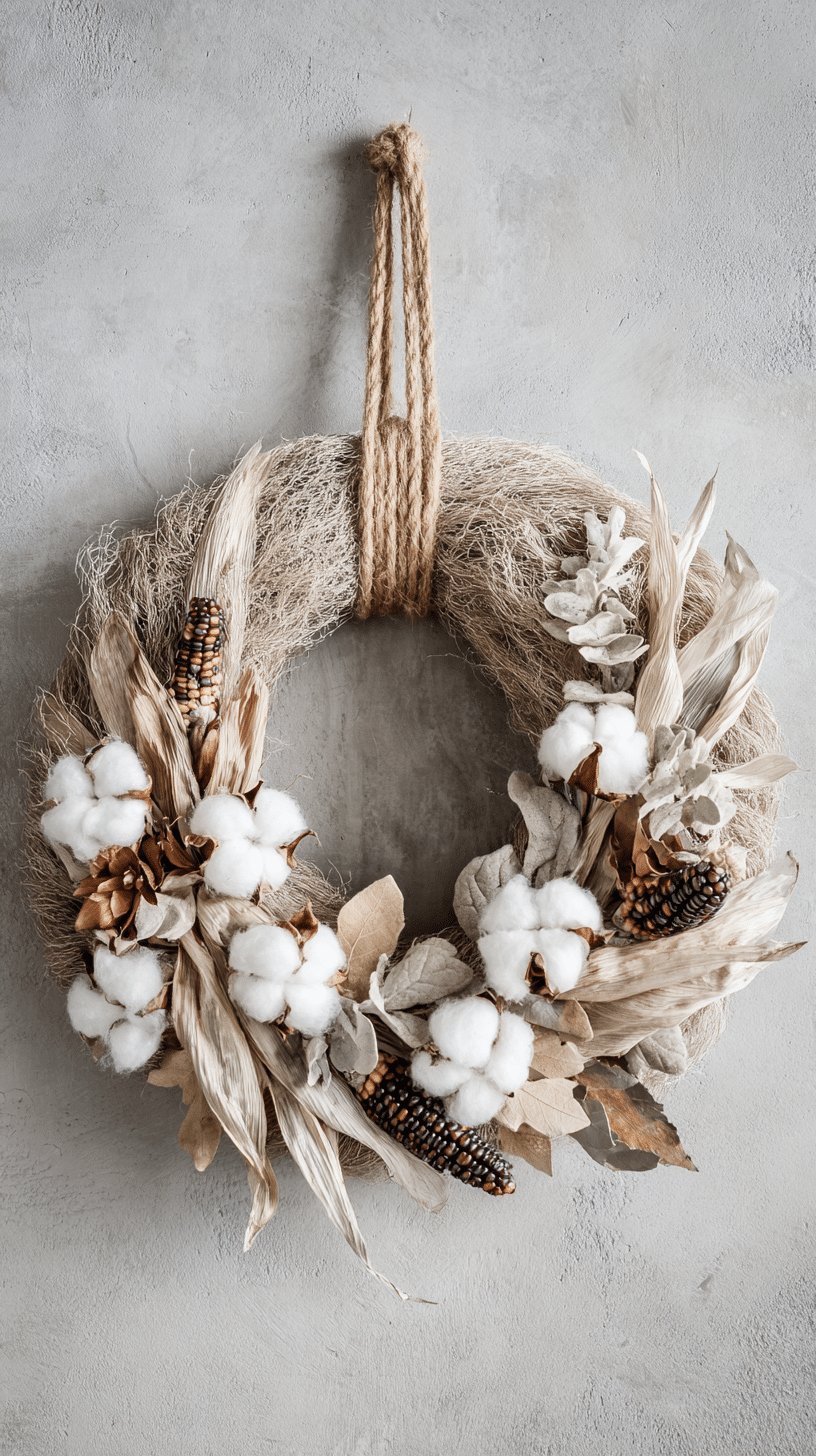 I love how this wreath feels like a cozy whisper rather than a shout. The soft cotton bolls give it cloud-like sweetness, the dried corn and husks add that perfect rustic pop, and the tangled natural-fiber base and rope hanger keep everything feeling effortless and a little homespun.