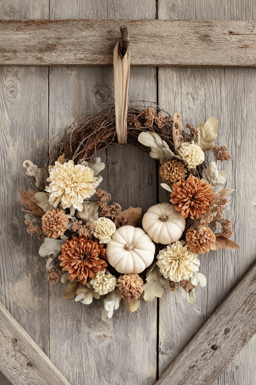 I love how this wreath feels like fall without shouting it. The soft cream pumpkins, rust and butter yellow blooms, and dusty green leaves sit on a twiggy grapevine base that reads warm and gathered, not fussy.