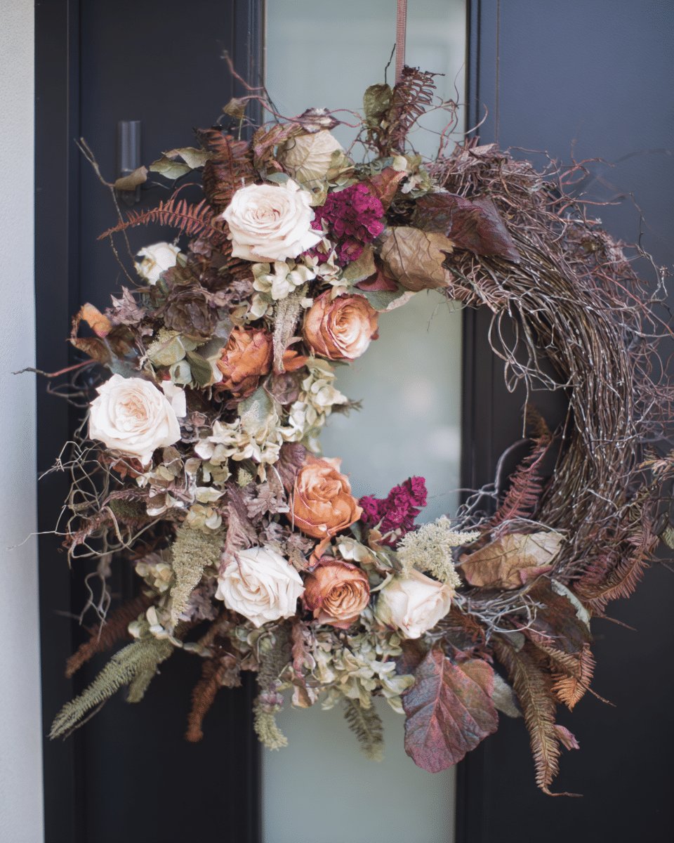 I love the slightly wild, vintage-rose energy of this wreath. The mix of blush and burnt-orange roses, dried hydrangea, rusted leaves, and wiry grapevine gives it so much texture and movement that it reads cozy, not contrived.