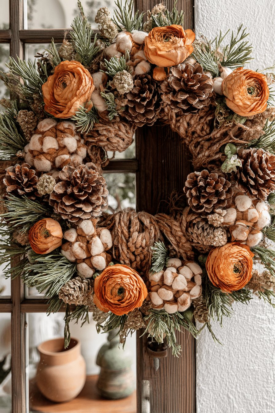 I love the cozy, textural feel of this Thanksgiving wreath. The chunky braided rope and frosted pinecones give it serious tactile warmth, while the cotton bolls and orange ranunculus add a playful, unexpected softness.