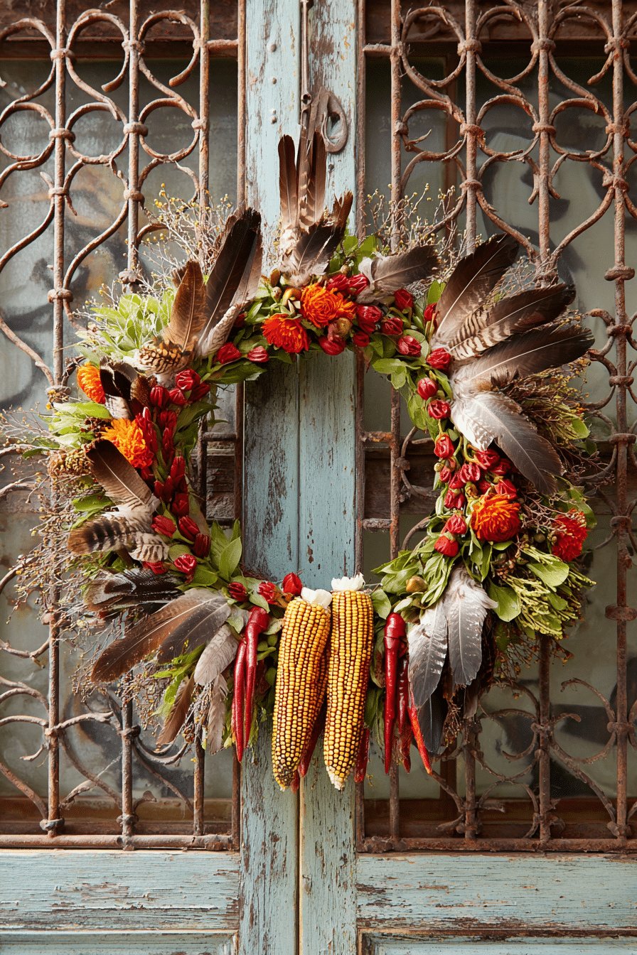 I love the slightly wild, theatrical vibe of this Thanksgiving wreath. The feathers give it movement and a touch of drama while the orange blooms, tiny red buds, and glossy greens keep it cozy and warm. The corn and chili accents add playful harvest charm without feeling kitschy.