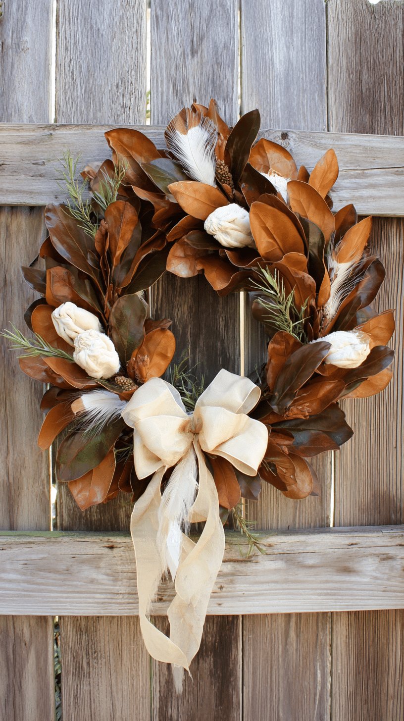 I love the rich, buttery glow of this wreath. The glossy magnolia leaves give it warm, old-soul energy while those soft cream fabric pumpkins and feathers keep it feeling fresh and slightly unexpected.