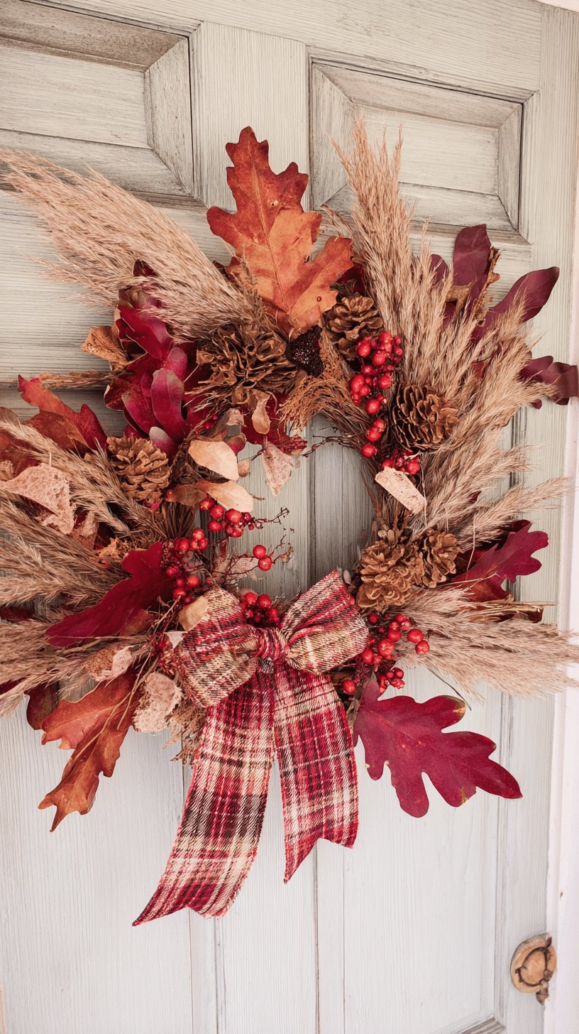 I love how this wreath reads like a cozy autumn hug. The feathery pampas and oak-shaped burgundy leaves give great movement, while the pinecones and bright red berries add that classic Thanksgiving cheer.