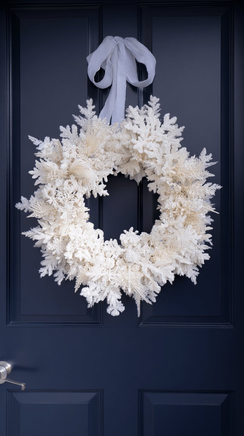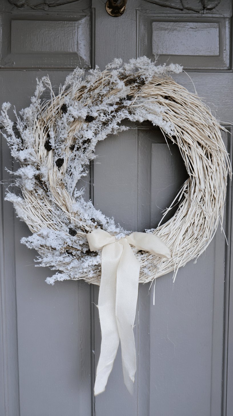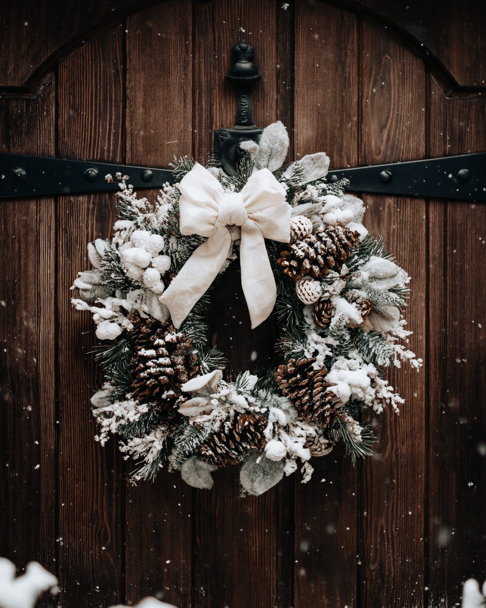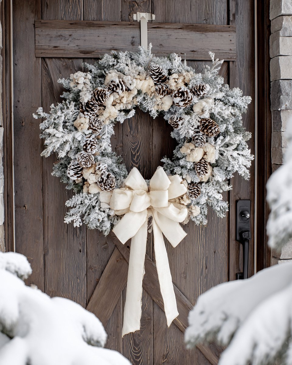 Style it simply so the wreath can do the talking. I’d hang it with warm fairy lights or a single brass lantern nearby, add a woven doormat and a stack of birch logs or a plaid throw on a bench. Keep decorations neutral and textural—think linen ribbons, wooden beads, and candle clusters—so the snowy details stay the star.