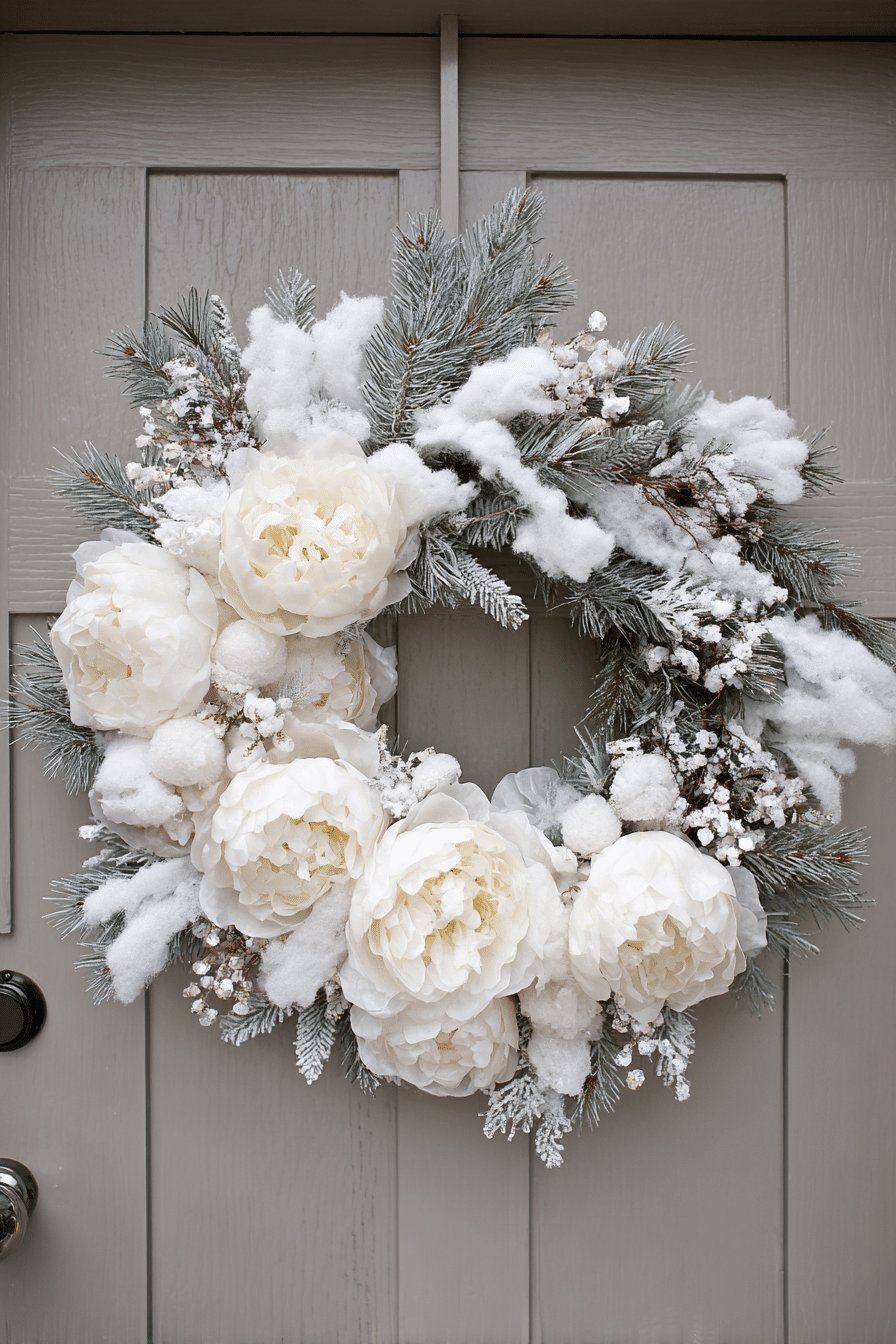 I love the calm, wintry luxury of this White Christmas Wreath. Big creamy peony blooms sit against frosted pine and cottony snow clumps, so the look feels snowy without being twee.