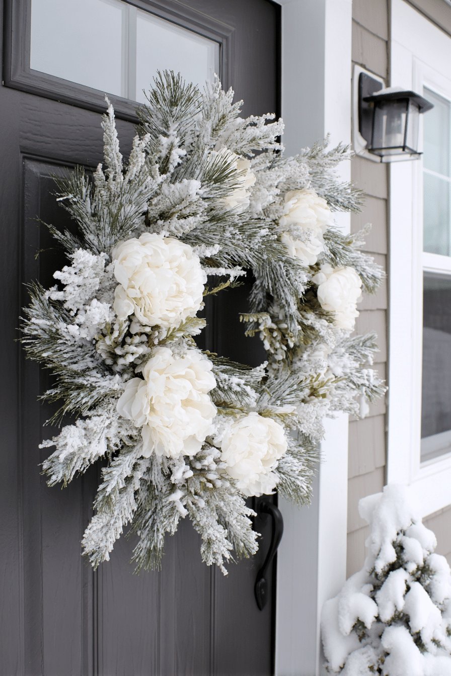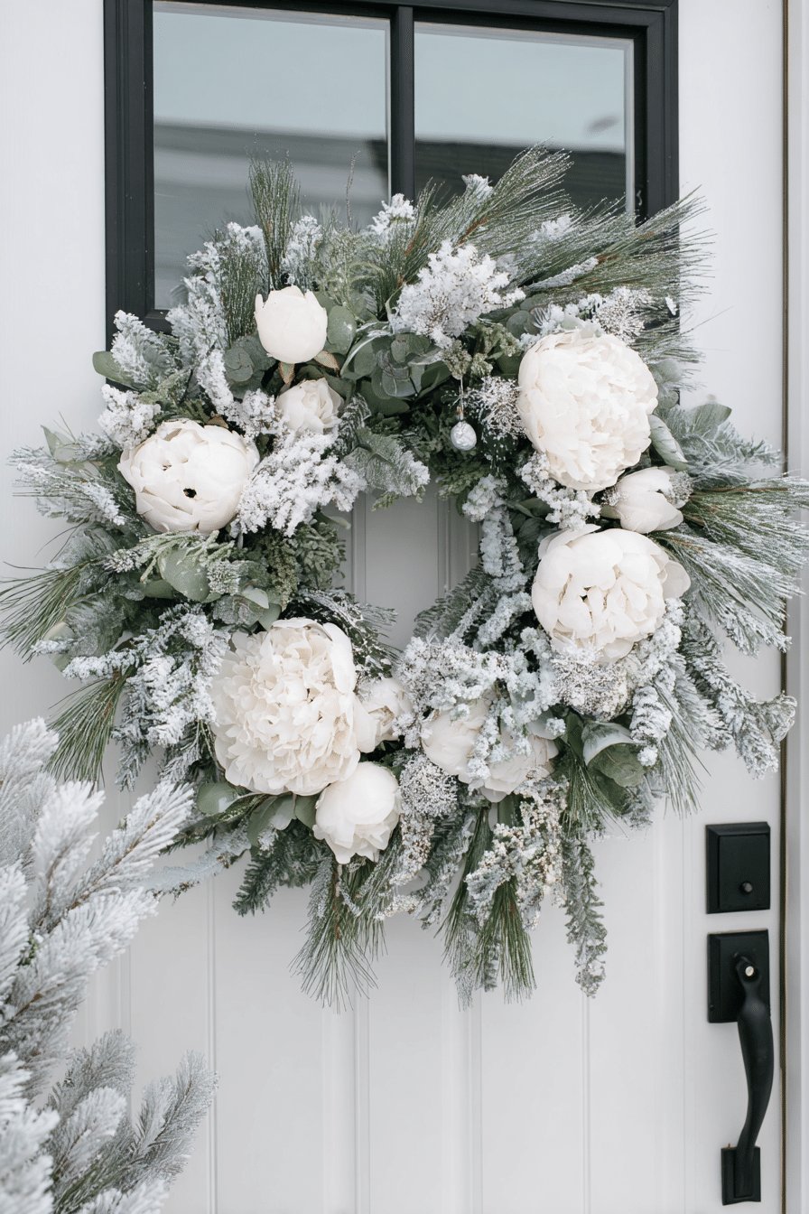 I love how this White Christmas Wreath reads like a snowy secret on a dark door. Flocked pine branches give it that fresh-flown-snow look while oversized creamy peony blooms add soft, unexpected glamour.