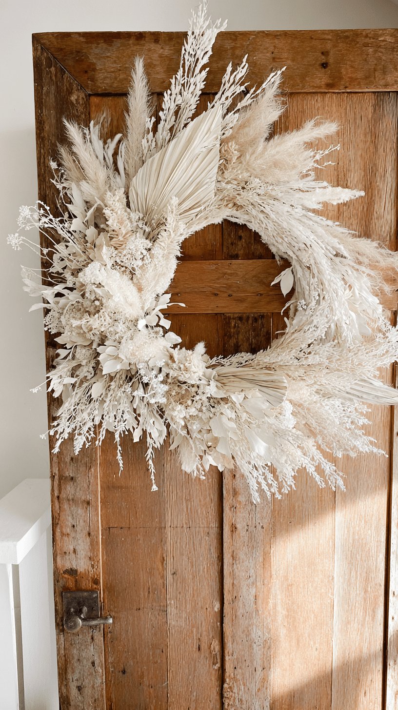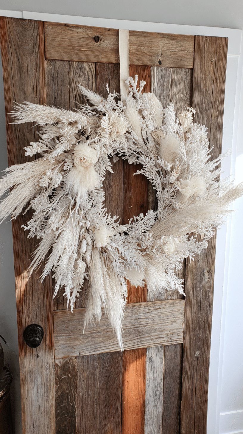 Style it on reclaimed wood or a painted neutral door so the warm grain plays off the ivory tones. Pair with tapered candles, a linen runner, and a few brass or wooden accents for a cozy contrast, or tuck tiny warm-white fairy lights into the grasses for evening glow. Keep other decorations minimal and natural so the wreath stays the quiet, effortless star.