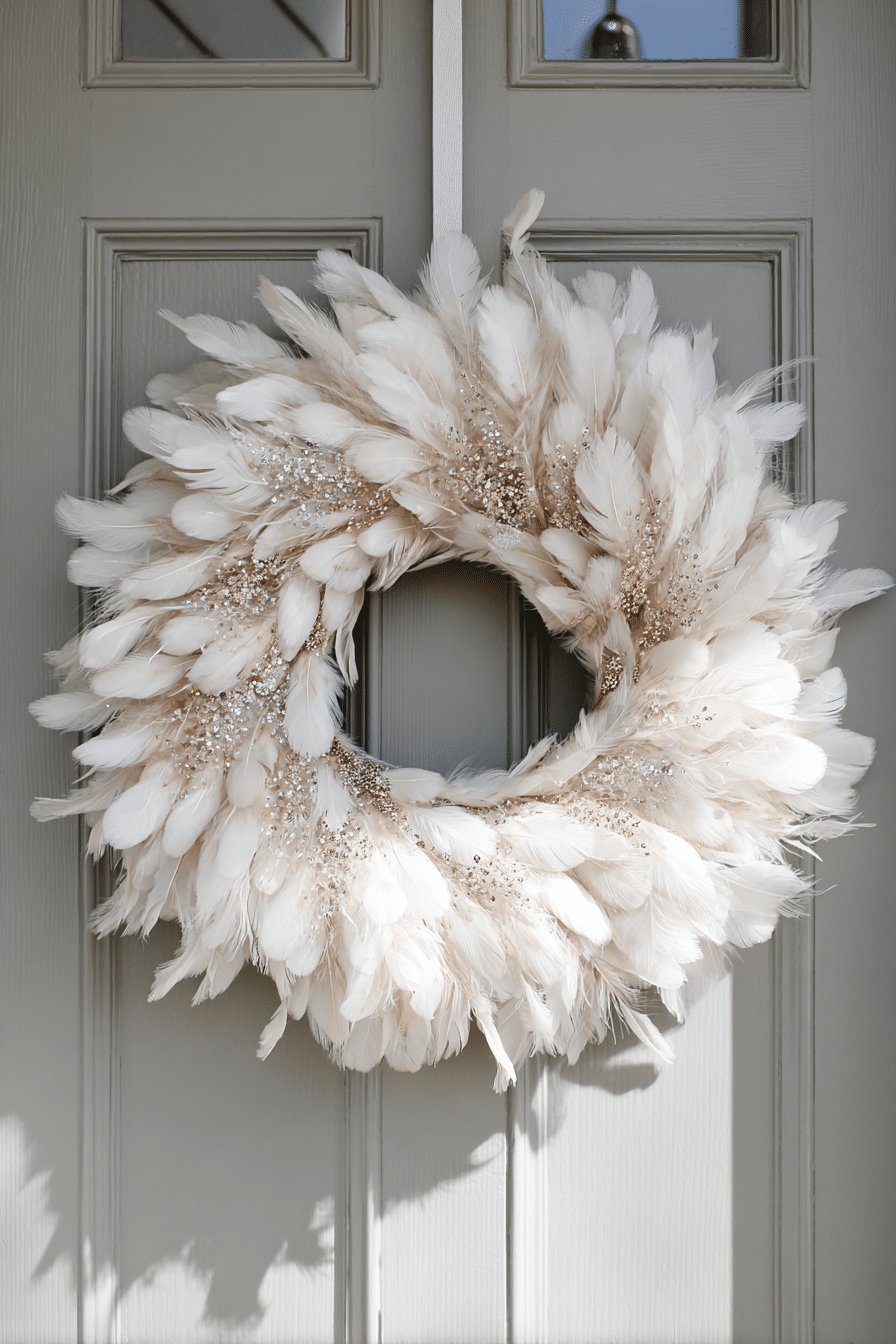 I love how this White Christmas Wreath looks like someone wrapped a cloud for the holidays. Soft, plume-like feathers create a full, airy ring, while frosted silver fir sprigs peek out for just enough winter sparkle. A slim gold ribbon does the hanging, and the overall vibe feels modern, a little glam, and entirely effortless.