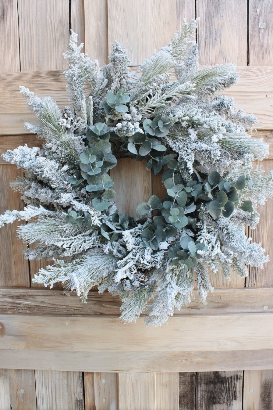 I love the calm, wintry hush of this White Christmas Wreath. Frosted pine branches and delicate snowy sprigs give it that powdery, just-swept look, while the silvery eucalyptus rounds add a cool, modern shape. Pine cones peek through for a little rustic charm, so the whole thing feels fresh and effortless instead of overdone.