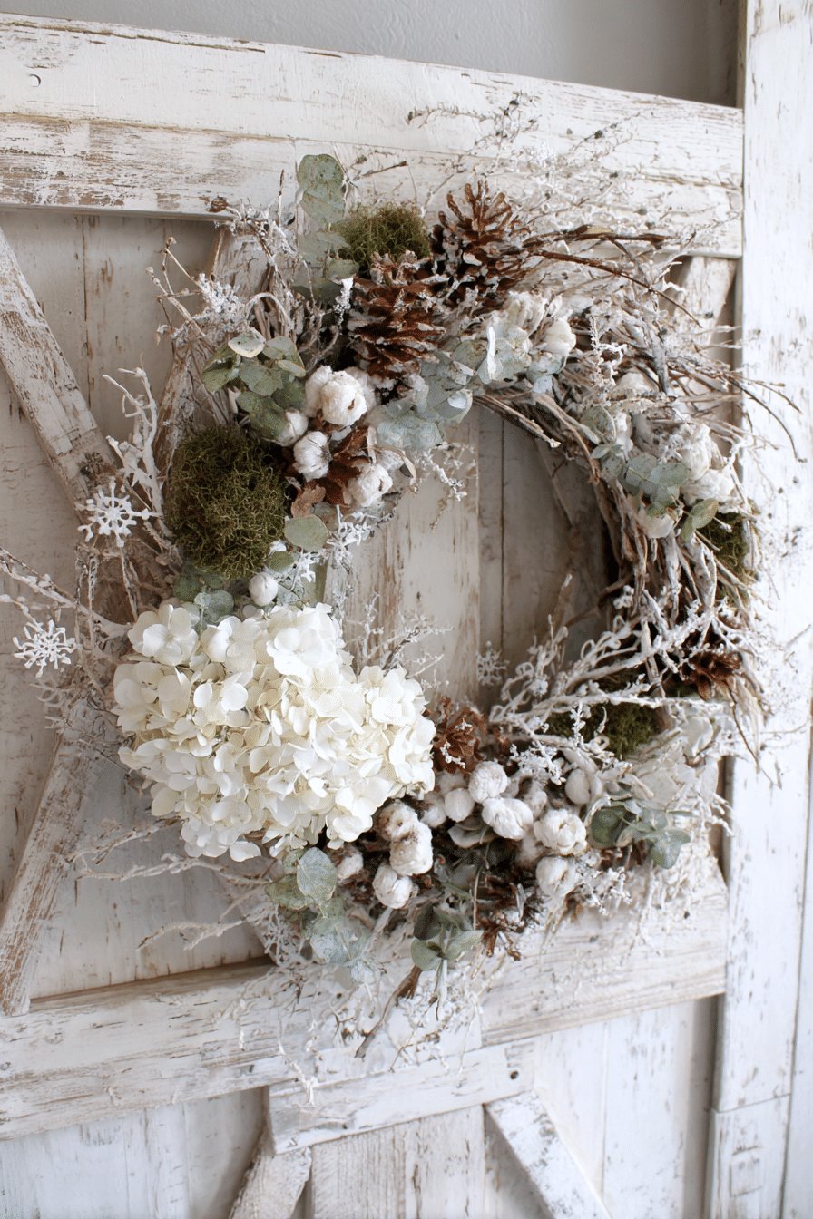 I love how this White Christmas Wreath feels like winter without trying too hard. A grapevine base cradles frosted twigs, eucalyptus sprigs, cotton bolls, pinecones and mossy balls, with a single cluster of white hydrangea that reads like a soft snowdrift.
