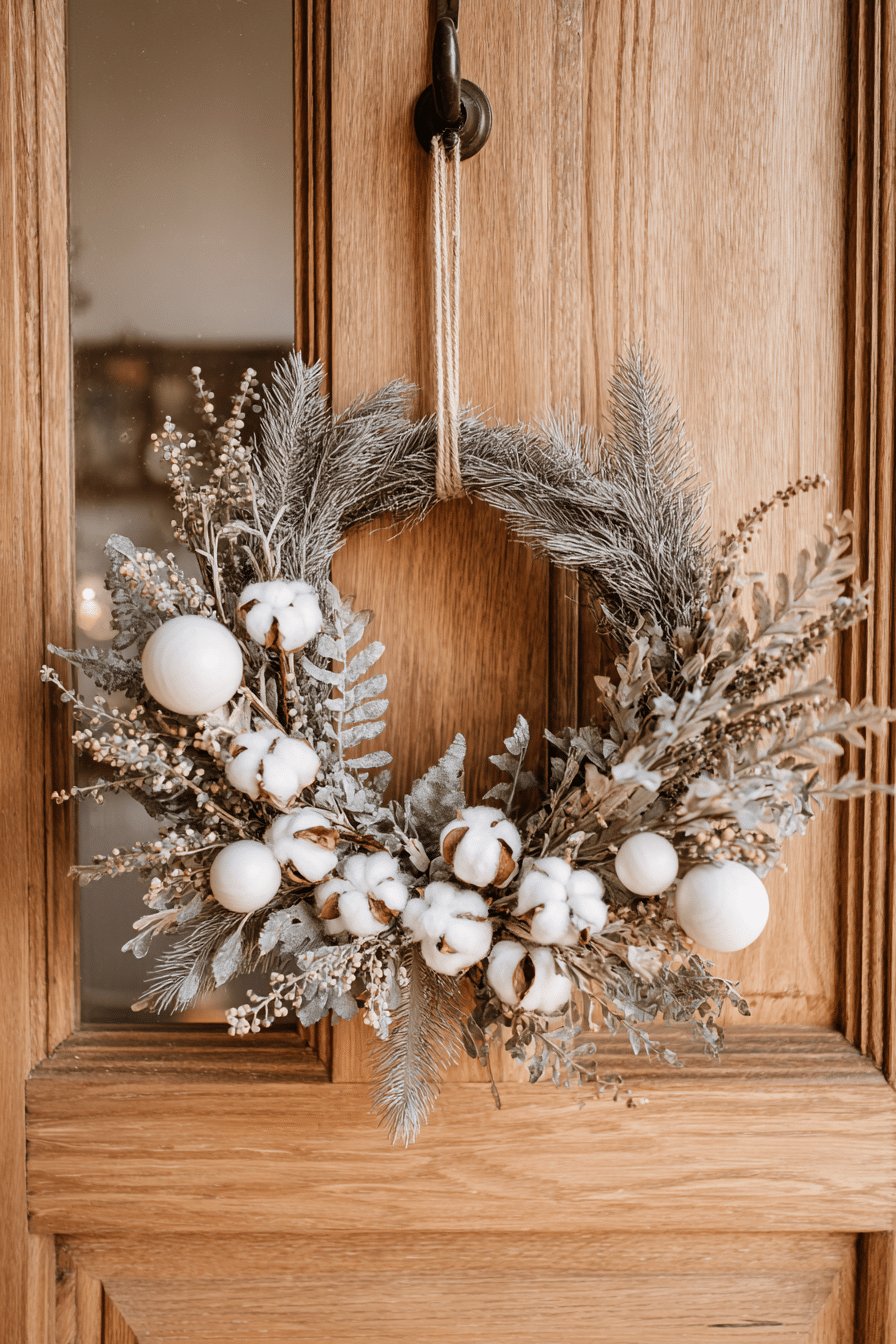 If you want a touch of glam, swap the jute for a velvet ribbon or tuck a single strand of warm white lights into the wreath. Keep the rest minimal so the soft whites and tactile cotton can do the talking.