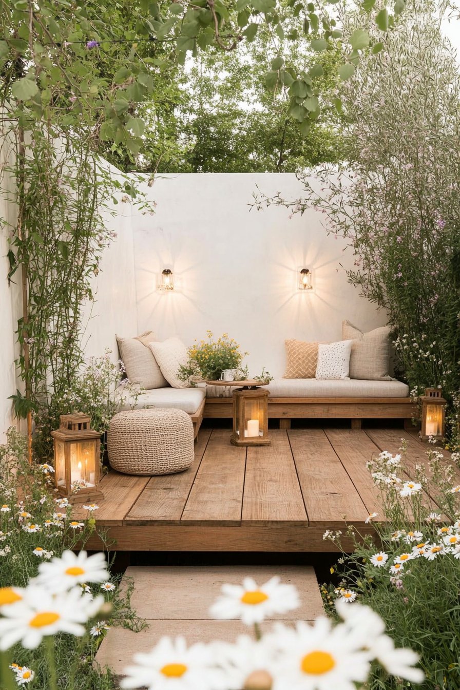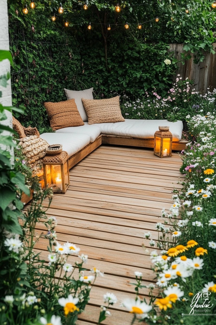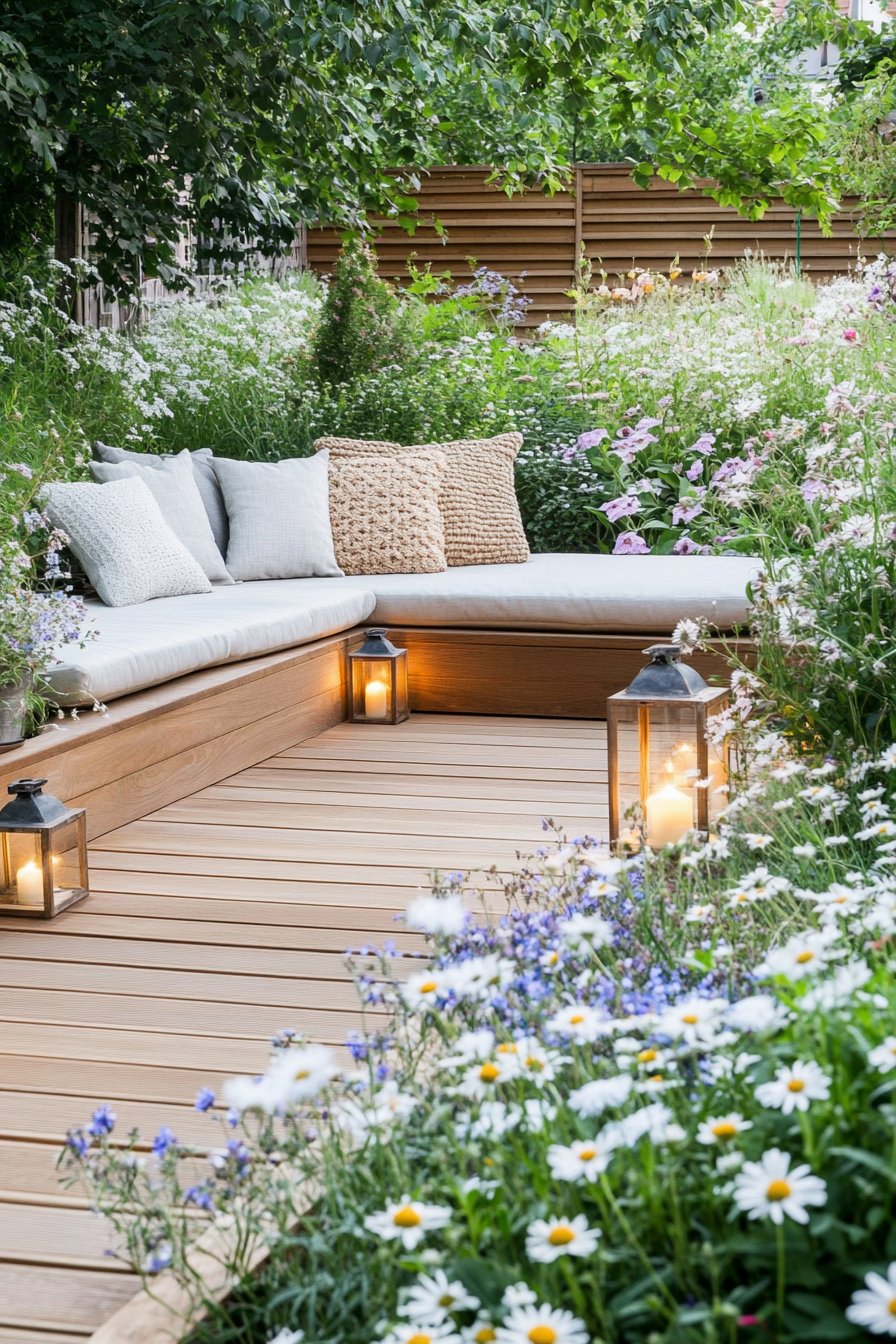 The design beautifully combines natural elements with a cozy seating area, creating an inviting retreat. A mix of delicate daisies and soft lavender blooms harmonizes with the warm tones of the wooden deck, while strategically placed lanterns add a touch of ambiance for evening gatherings.