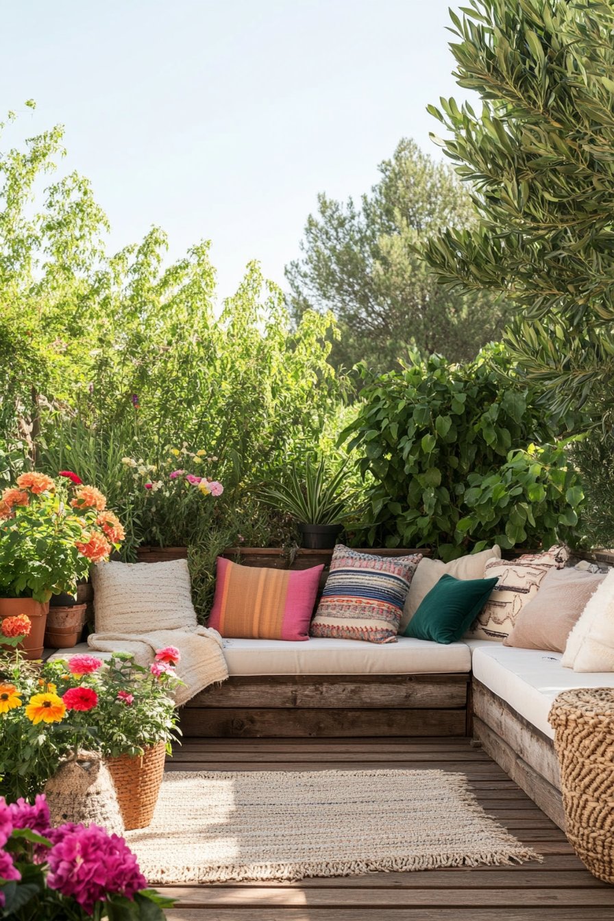 This design radiates warmth and vibrancy with its lush greenery and a riot of colorful blooms, including cheerful geraniums and zinnias that invite a sense of joy and relaxation. The cozy seating area, adorned with eclectic cushions, creates an inviting nook where one can unwind, making it perfect for afternoon tea or evening gatherings under the stars.