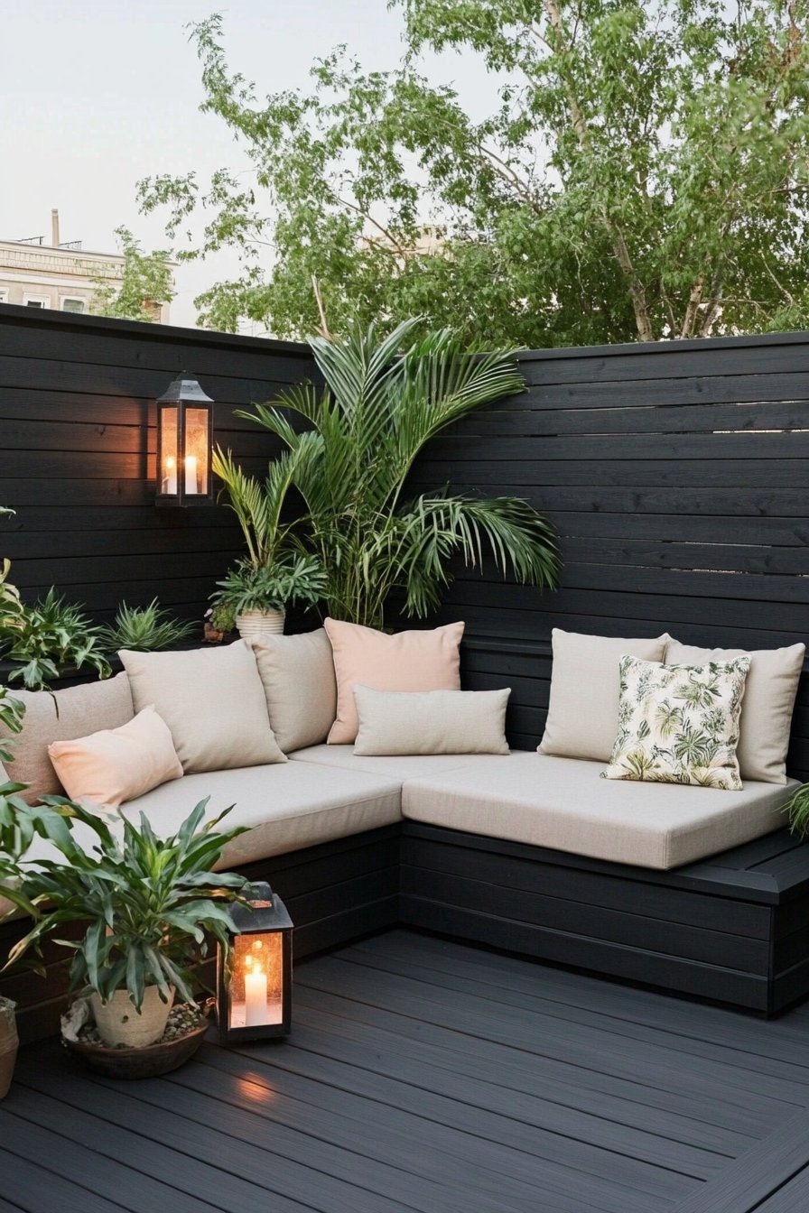 I absolutely adore the way this cozy modern patio retreat combines sleek black wood with soft, inviting furnishings, creating a perfect balance of comfort and style. The lush greenery, including palm and pothos plants, adds a vibrant touch, while the warm glow of lanterns enhances the intimate atmosphere, making it an ideal spot for relaxation.