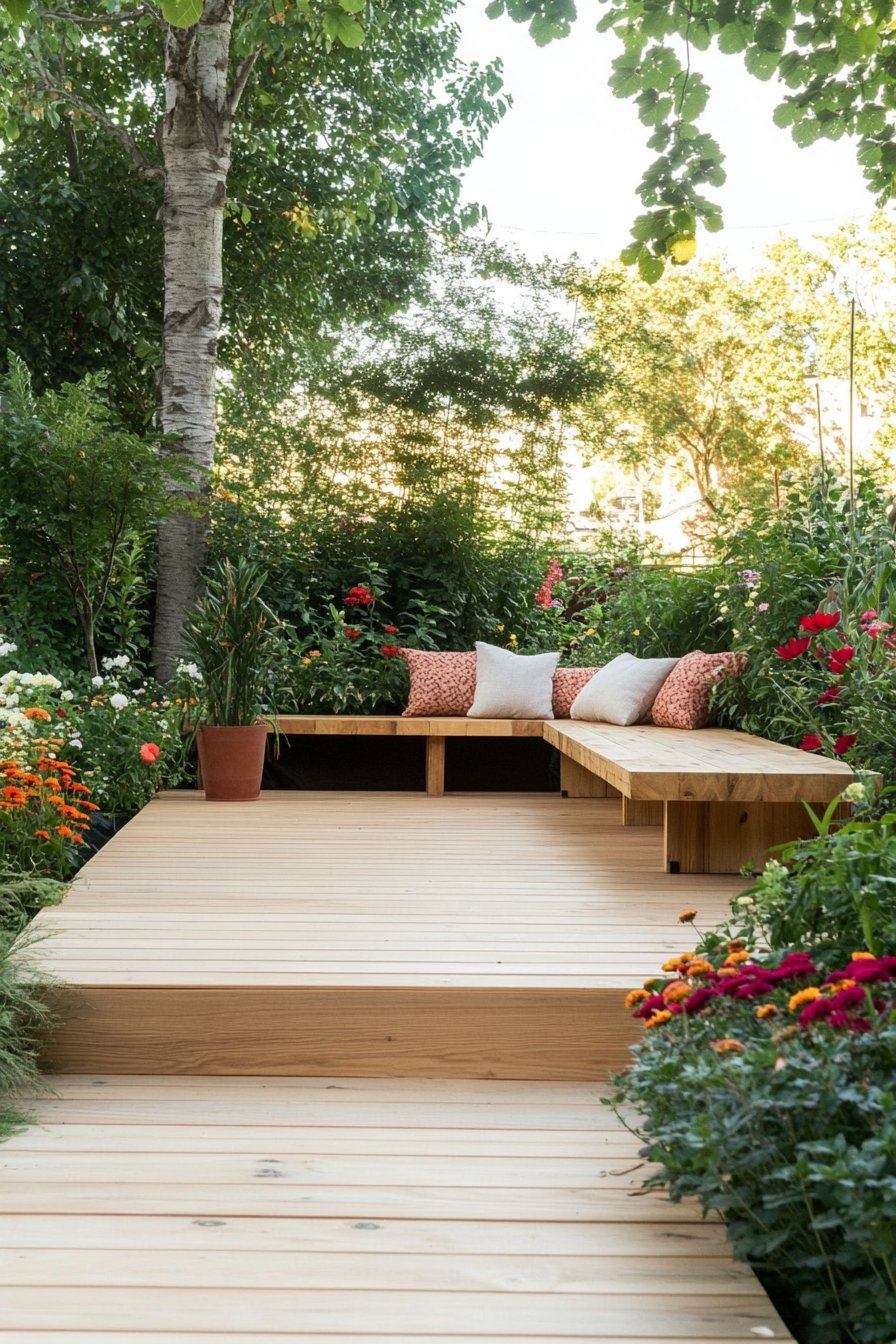 This garden design beautifully blends modern aesthetics with natural elements, creating a cozy retreat perfect for relaxation and gatherings. The warm wooden seating area, adorned with vibrant cushions, is surrounded by a lush tapestry of colorful blooms like lavender, daisies, and delicate perennials, inviting nature into the space.