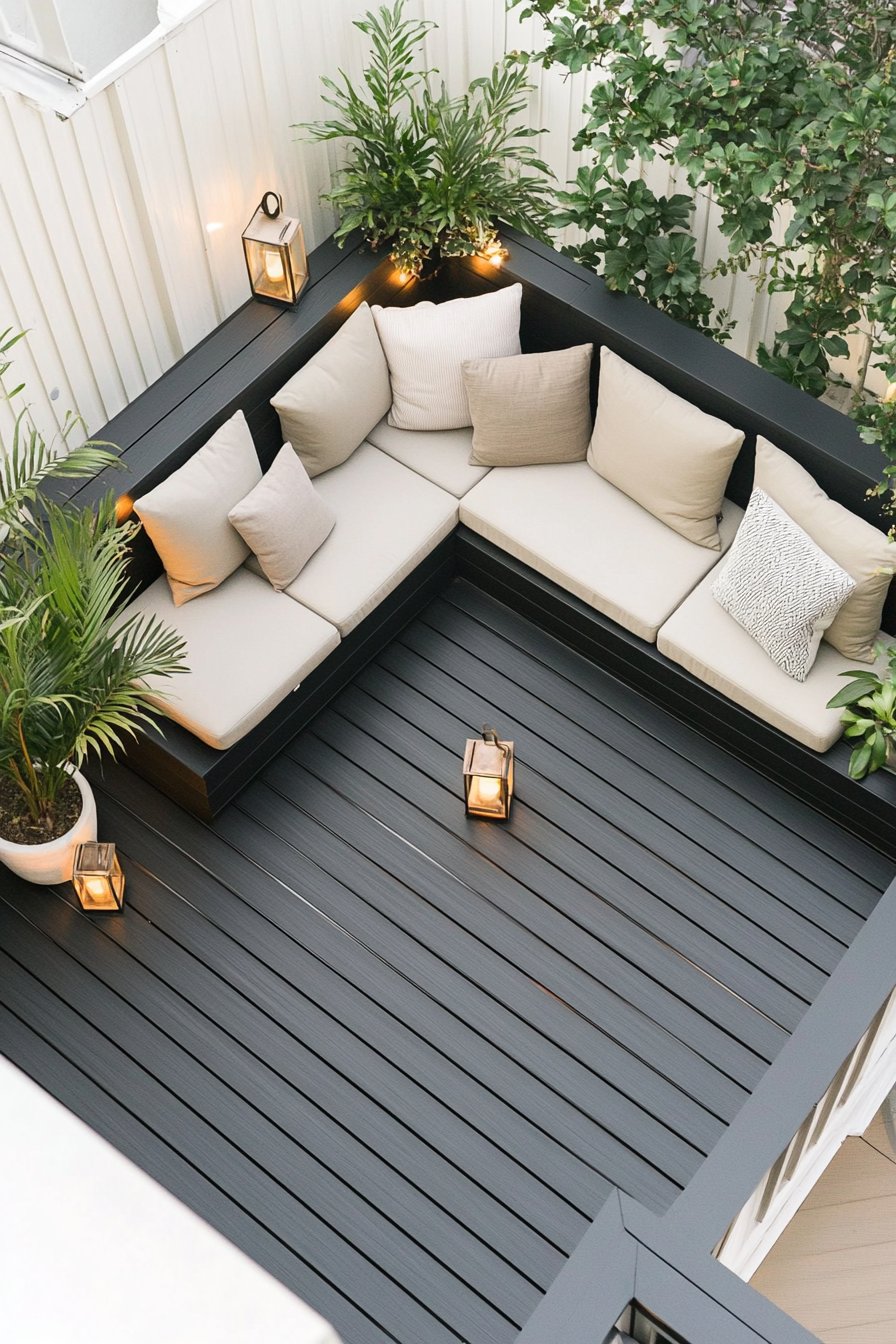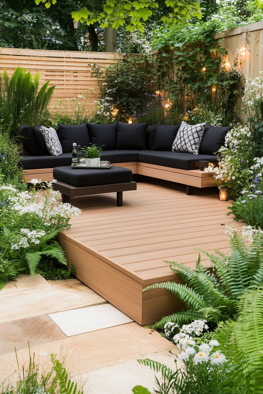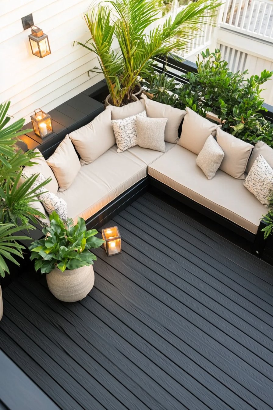This cozy modern patio retreat masterfully blends sleek lines with inviting textures, creating a perfect space for relaxation. The rich, dark decking contrasts beautifully with lush green plants like ferns and palms, while soft, neutral cushions invite you to sink in and unwind.