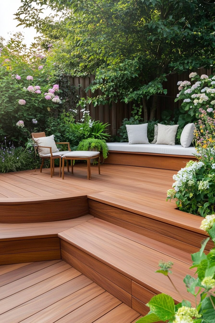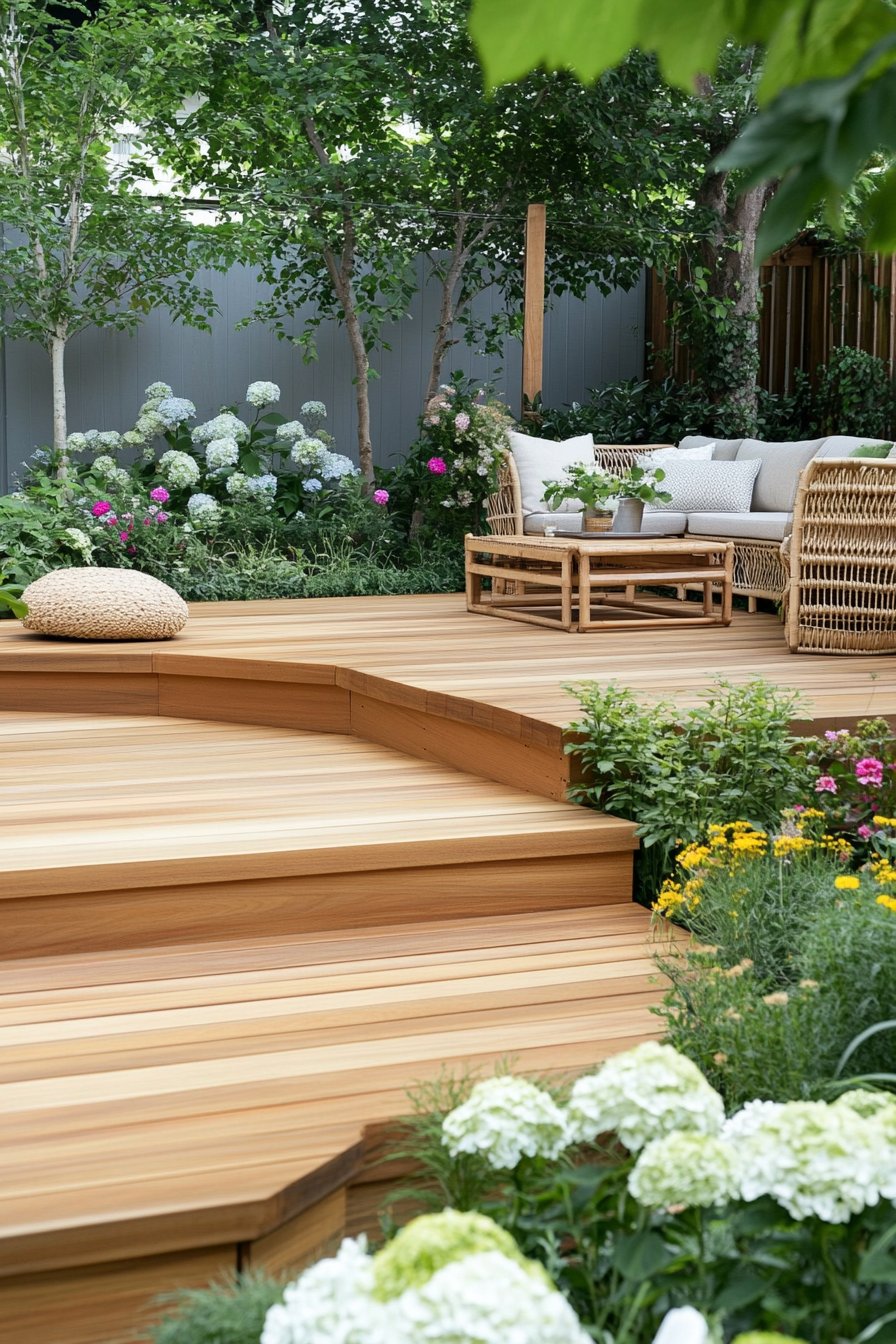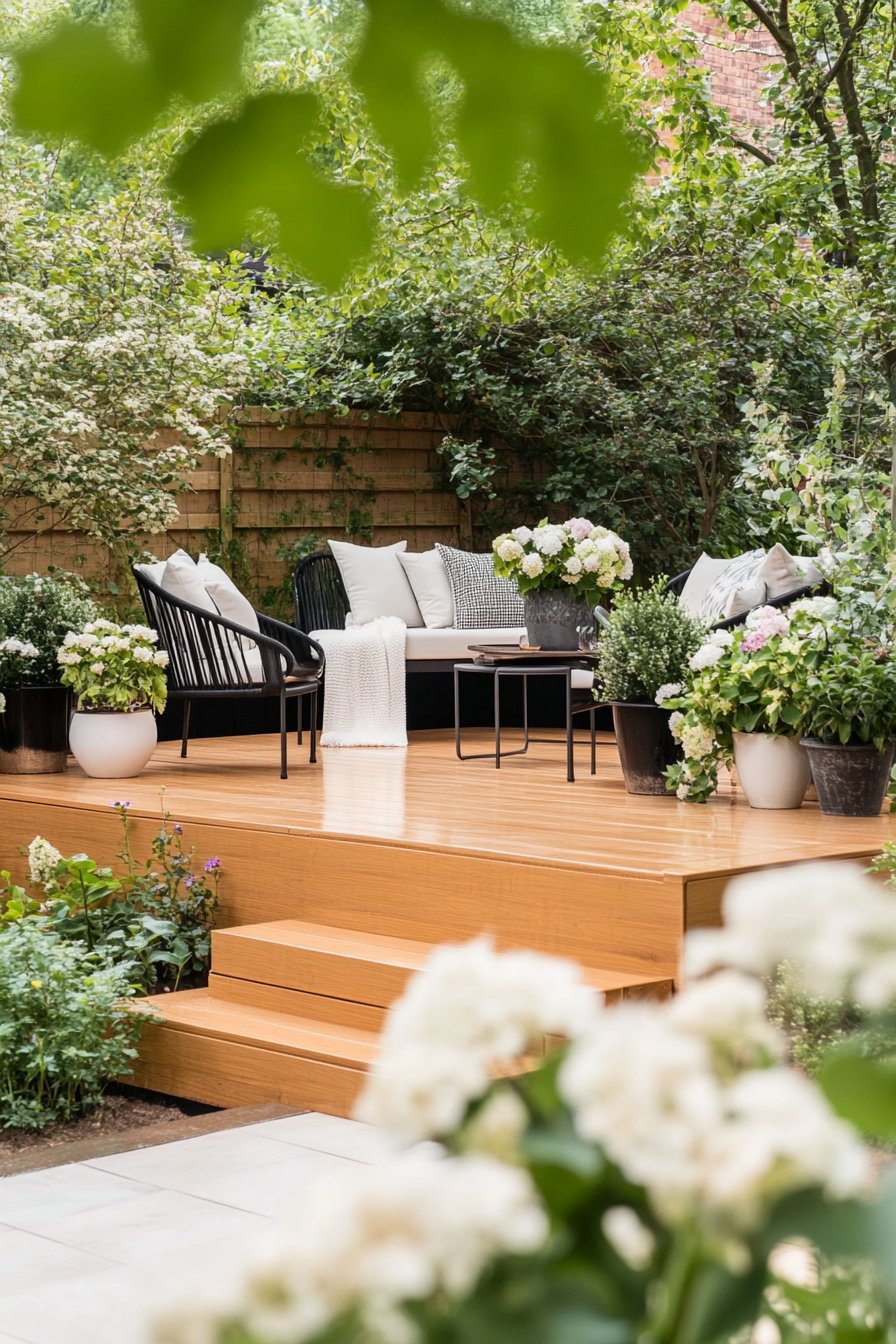 The warm wooden decking creates a welcoming foundation, perfectly complemented by lush greenery and delicate that add a touch of elegance and serenity. Incorporating low-maintenance plants like creeping thyme and hardy ferns alongside cozy seating with textured cushions can elevate your outdoor space into a tranquil retreat.