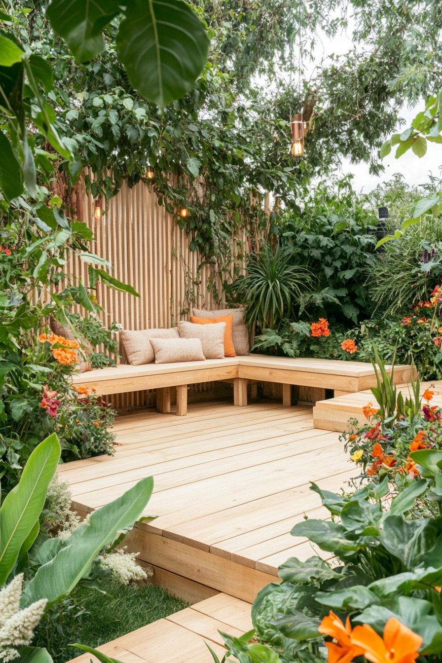 This design radiates warmth and tranquility with its inviting wooden deck surrounded by cheerful daisies and vibrant marigolds, creating a perfect floral retreat. I love how the cozy seating area, adorned with natural textures and soft cushions, invites you to unwind and enjoy the beauty of nature, especially under the twinkling string lights that add a magical touch in the evening.