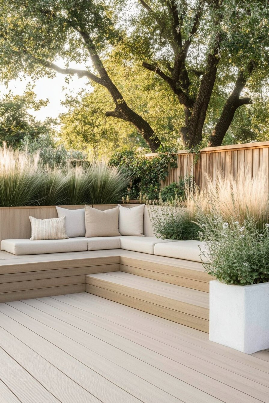 To achieve this serene vibe at home, consider incorporating layered plantings with a mix of perennials like hydrangeas and daisies alongside structural trees for height. Utilize warm-toned decking and comfortable outdoor furniture to enhance the inviting atmosphere, and don’t forget to add cozy accessories like soft cushions and textured poufs for an extra touch of comfort.