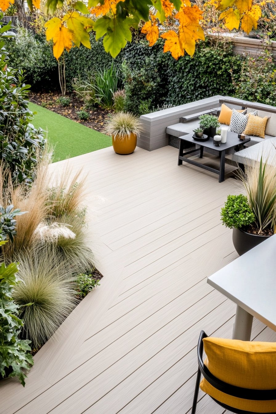 This contemporary outdoor living space captivates with its harmonious blend of sleek lines and natural textures, creating an inviting atmosphere for relaxation and socializing. The soft hues of the decking paired with the vibrant yellows of cushions and planters add warmth, while ornamental grasses and structured shrubs provide a lush backdrop, making it a perfect sanctuary.