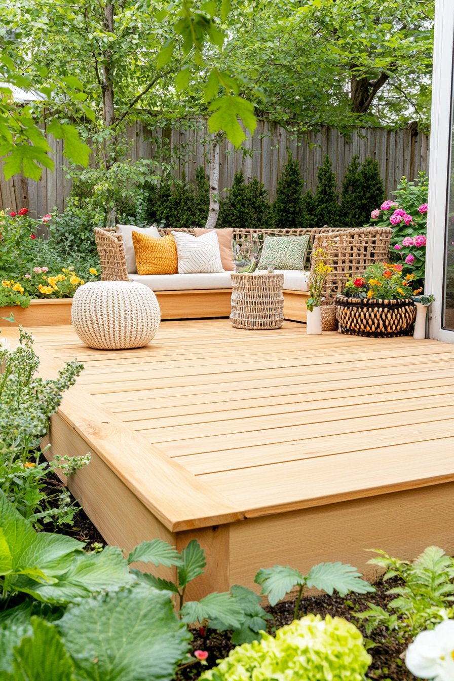 This garden design beautifully blends modern aesthetics with a cozy atmosphere, featuring a warm wooden deck that invites relaxation. The vibrant mix of marigolds, petunias, and lush greenery creates a cheerful palette, while textured accessories like woven baskets and plush cushions add comfort and style.