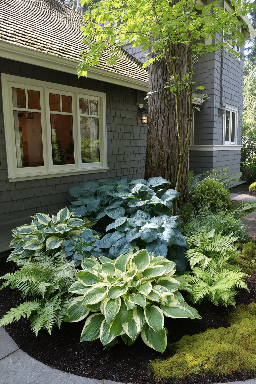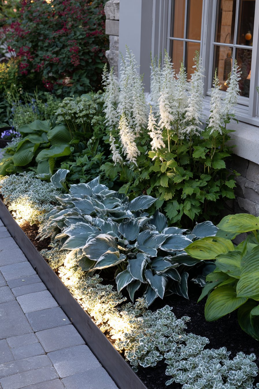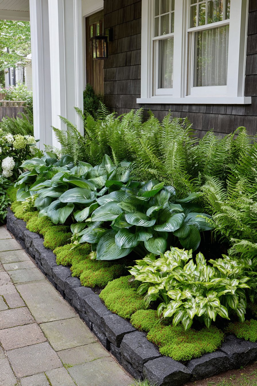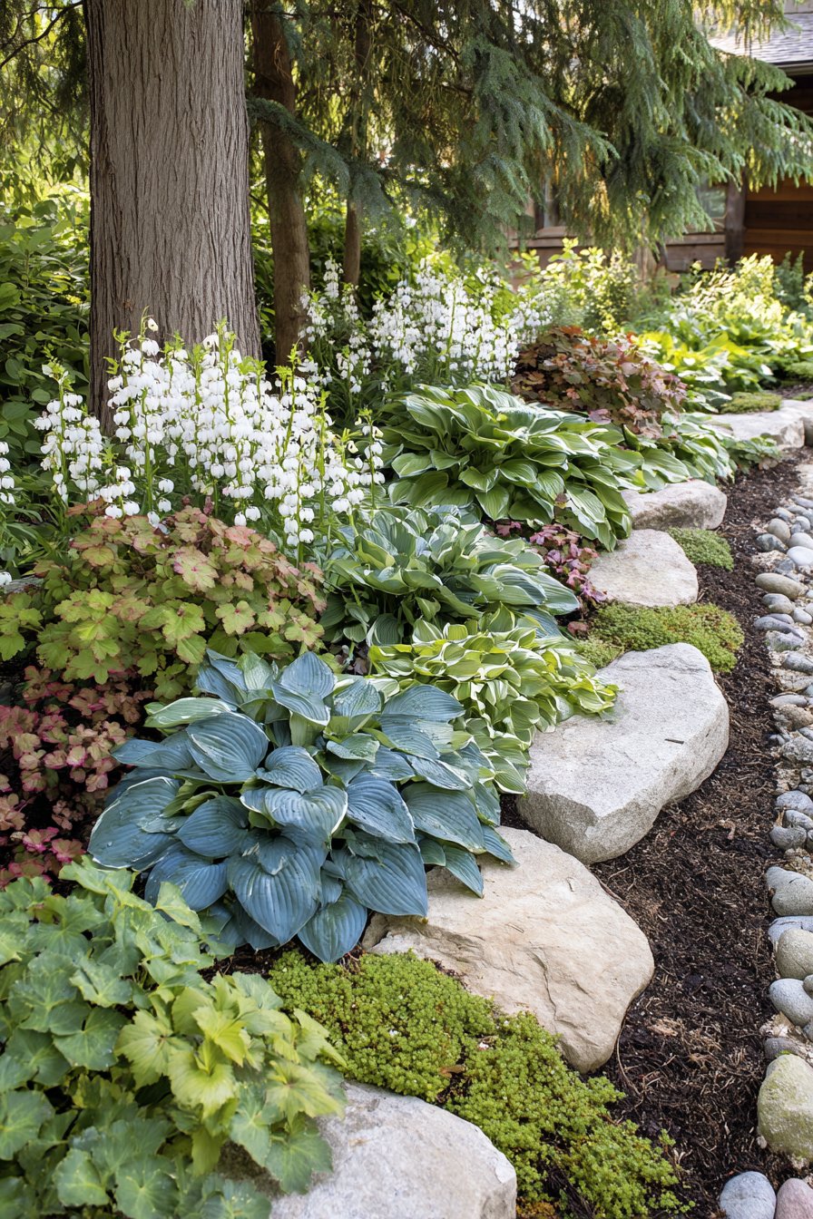 This flower bed features lush hostas in various shades of green, paired with delicate white flowers that add a lovely contrast. To recreate this look, mix different hosta varieties with ground covers like creeping thyme and use natural stones to define the space.