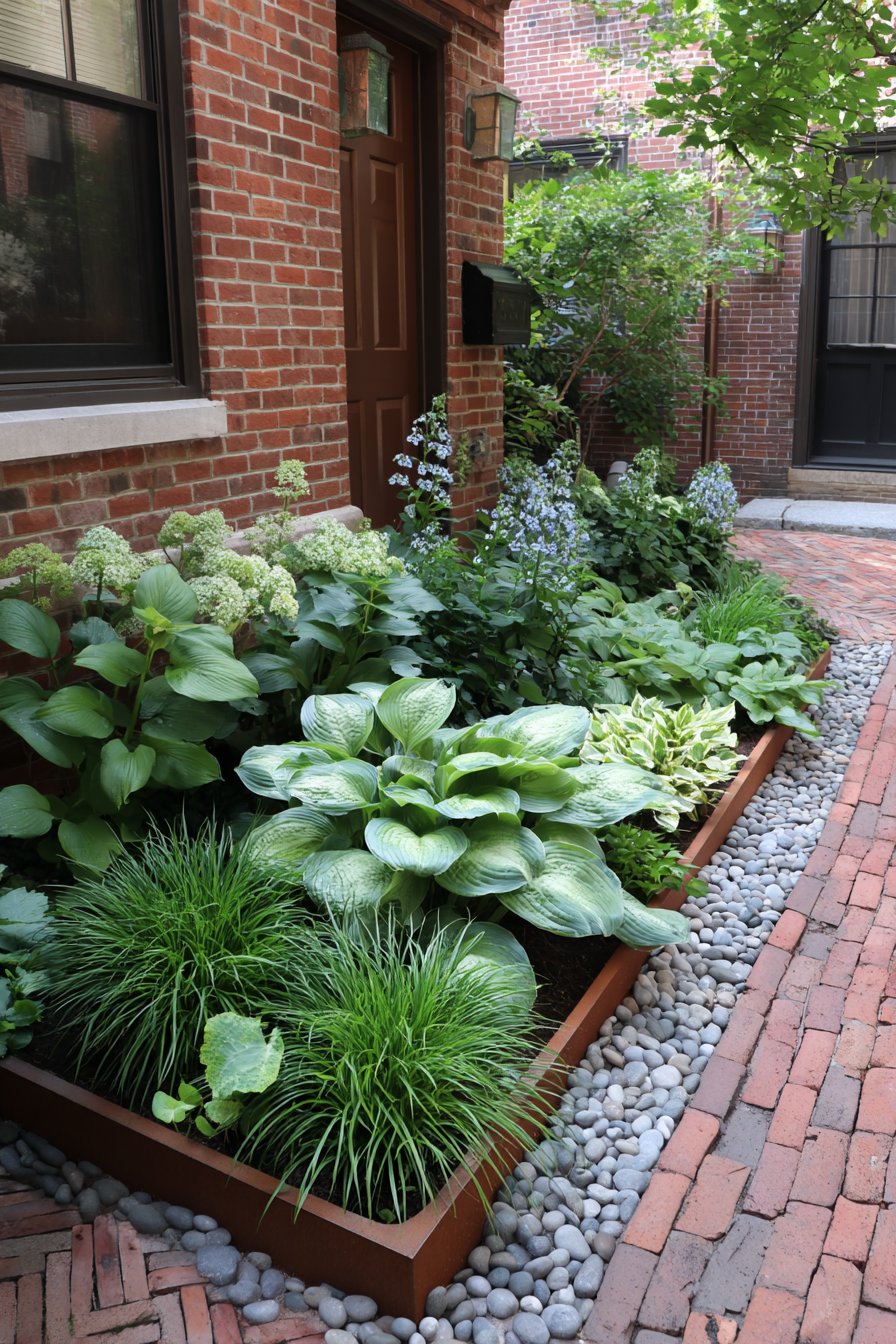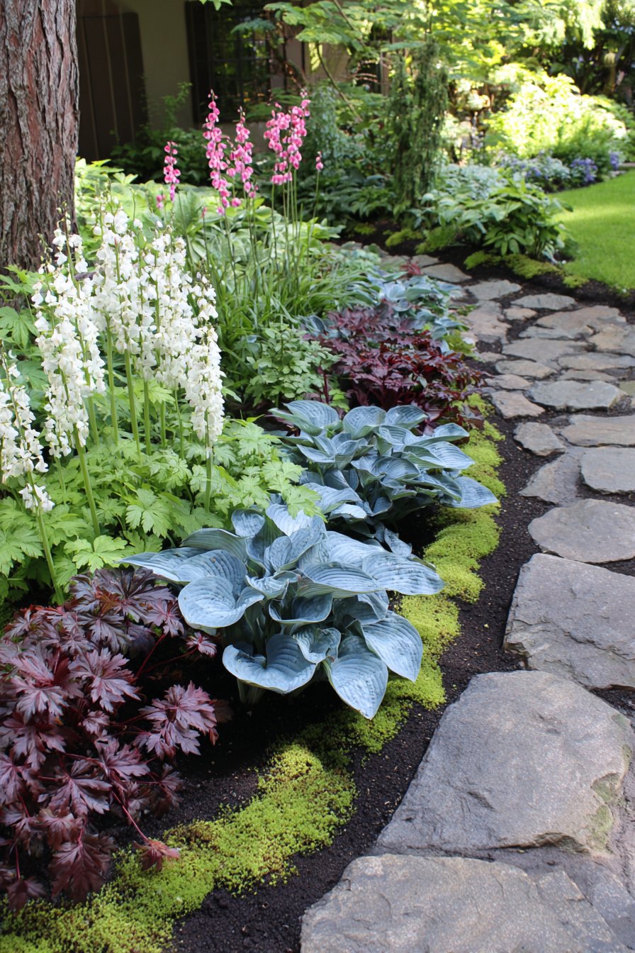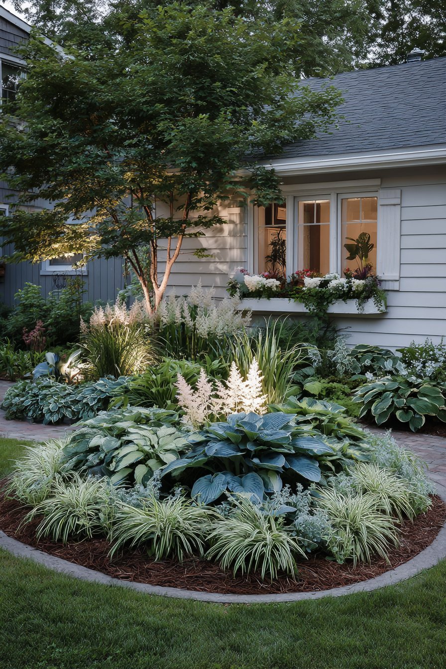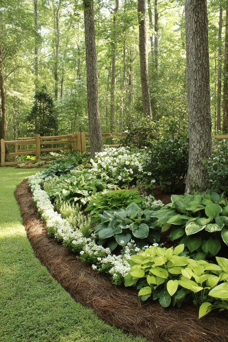 This flower bed features lush hostas in various shades of green, paired with delicate white flowers that add a lovely contrast. To recreate this look, mix different hosta varieties with ground covers like creeping thyme and use natural stones to define the space.
