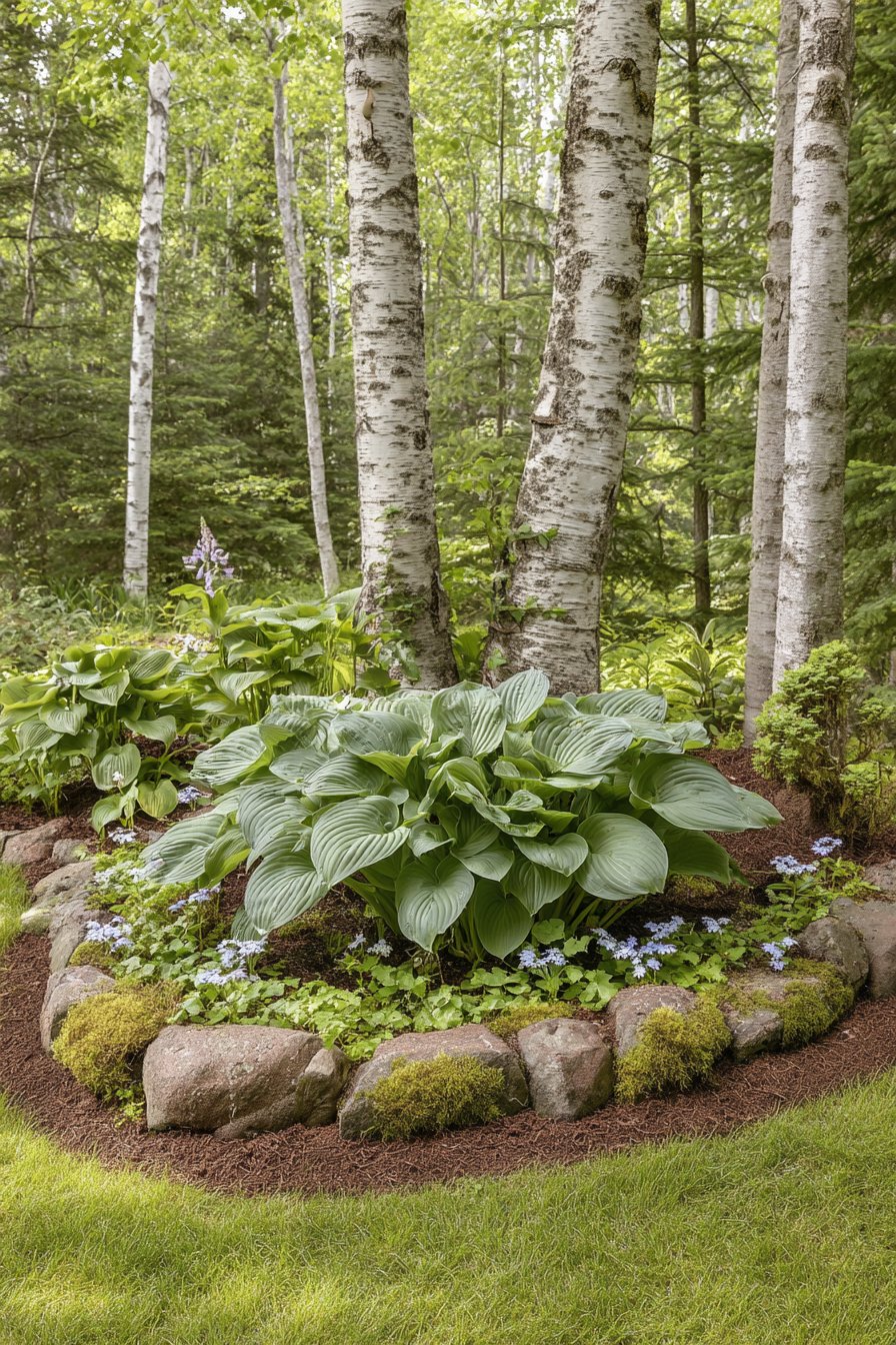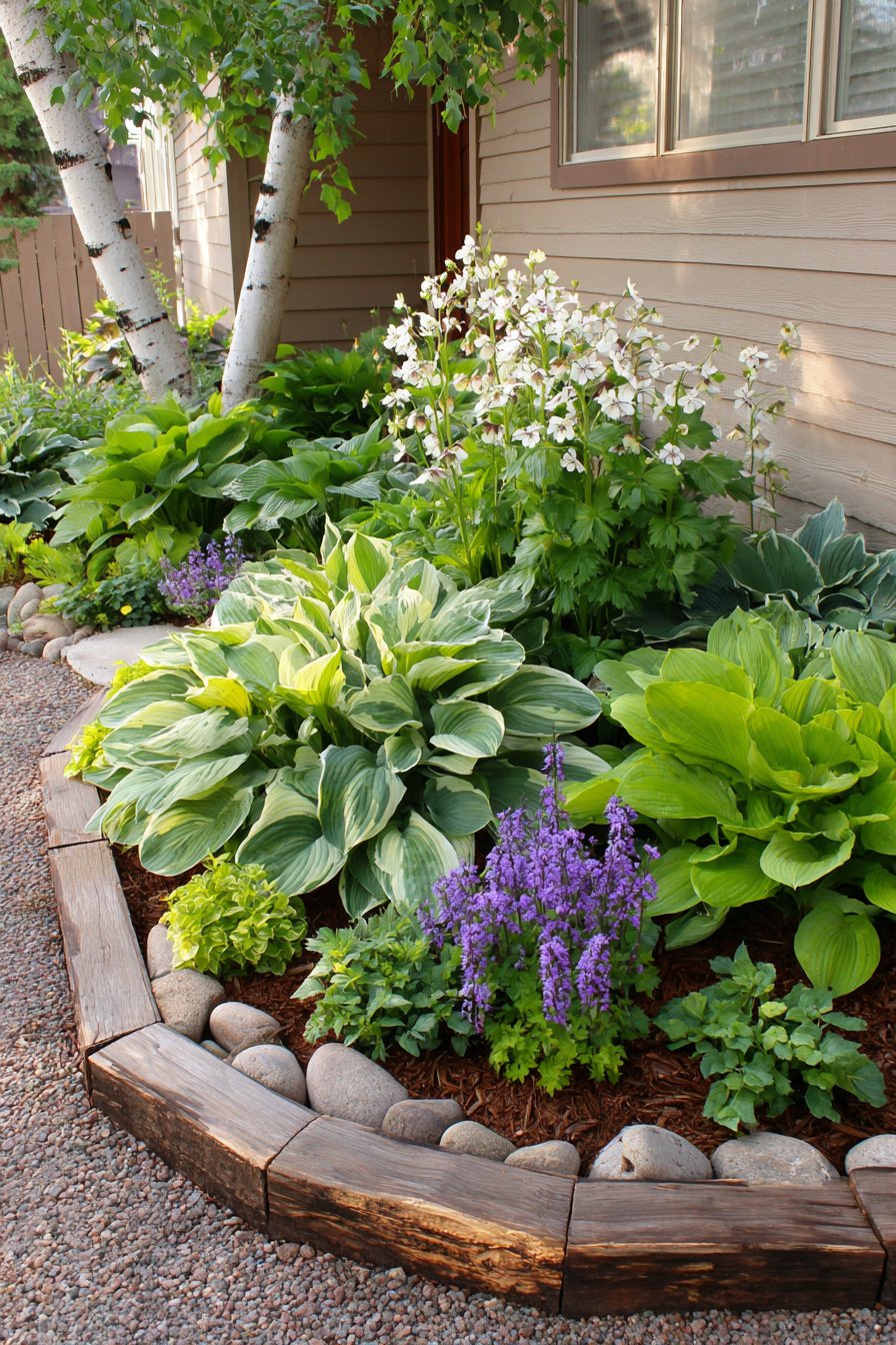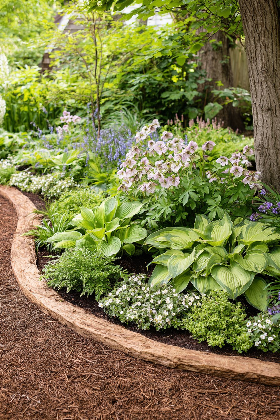 Lush hostas create a vibrant backdrop, paired with cheerful purple flowers and fresh greens that pop against the earthy tones of the mulch. To achieve this look, mix different hosta varieties with colorful perennials and use natural stone or wood for borders.