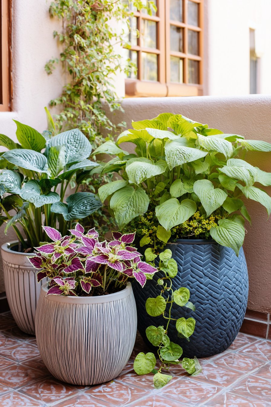 The lush hostas create a vibrant backdrop, beautifully complemented by the striking colors of coleus and the subtle textures of decorative pots. For a similar look, mix different hosta varieties with colorful foliage plants and choose varied planters to add depth and interest.