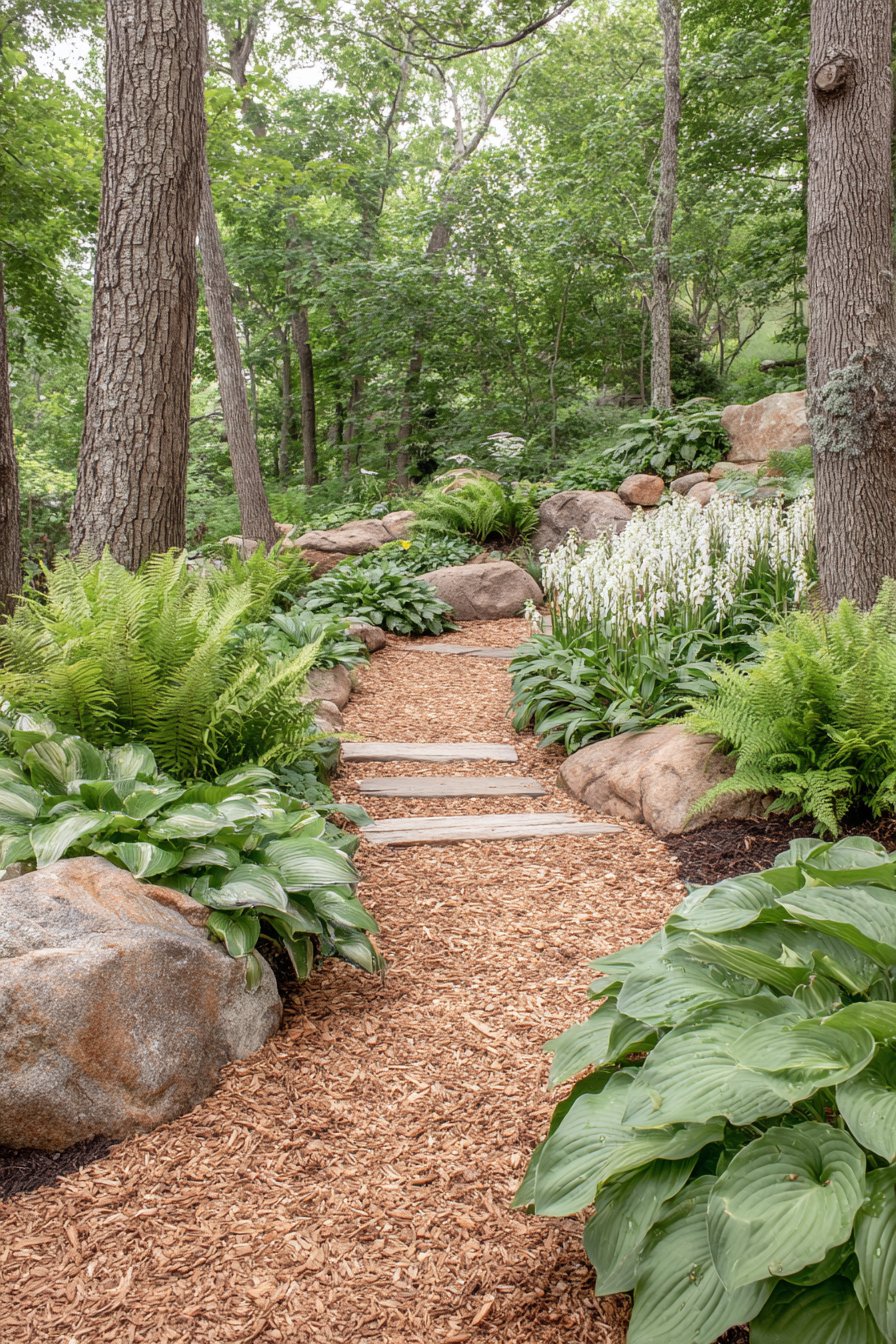 A winding path of wooden stepping stones leads through lush, green hostas and ferns, creating a serene retreat. To achieve this look, mix different hosta varieties with ferns and add natural stones for texture.