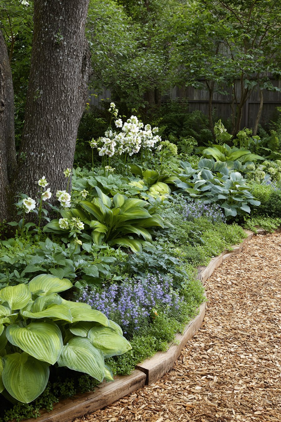 Plants in this design may include hostas, hellebores, bluebells, and creeping phlox.